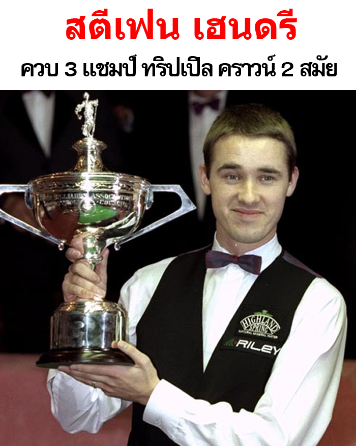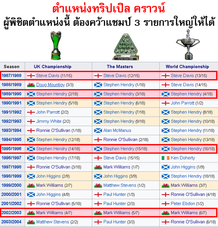 16 ปี แห่งความหลัง….นับเป็นเวลานานนมถึง 16 ปีแล้ว ที่วงการสนุกเกอร์ยังไม่มีผู้ใดพิชิต ทริปเปิล คราวน์ (Triple Crown) หรือ 3 สุดยอดแชมป์รายการใหญ่ในปีเดียวได้เลย ทั้ง แชมป์รายการ World Championship, The Master และ UK Championship มีเพียง 3 ตำนานนักสนุกเกอร์อย่าง สตีฟ เดวิส, สตีเฟ่น เฮนดรี้ และ มาร์ค วิลเลี่ยมส์ เท่านั้นที่เคยทำไว้ได้ [Spoil] คลิกเพื่อดูข้อความที่ซ่อนไว้