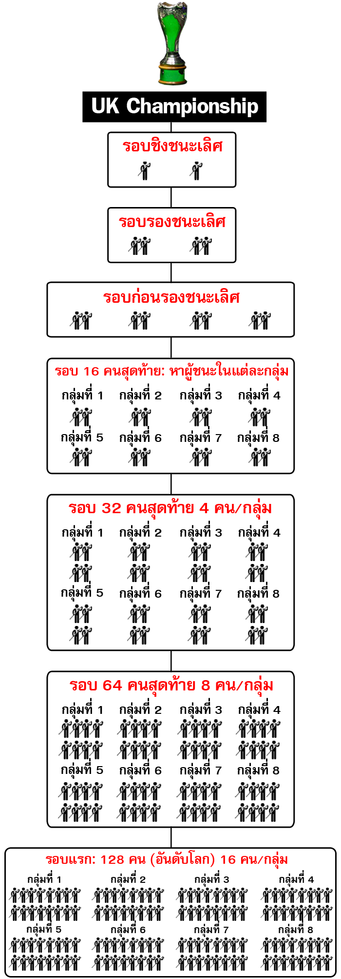 ยูเค แชมเปียนชิพ เป็นรายการแบบเก็บสะสมคะแนนโลก (World Ranking) สตาร์ทรอบแรกคือ 128 คนสุดท้าย ระบบ 6 ใน 11 เฟรมเท่านั้น (ใครได้ 6 เฟรมก่อนเป็นฝ่ายชนะ) โดยจะแบ่งออกเป็น 8 กลุ่ม กลุ่มละ 16 คน แข่งแบบน็อกเอาต์หาแชมป์แต่ละกลุ่ม ไล่ตั้งแต่รอบ 128 คน, 64 คน, 32 คน, 16 คน, 8 คน, 4 คนสุดท้าย ไปถึงรอบชิงชนะเลิศ โดยในปีล่าสุด รอนนี โอซุลลิแวน (2017/2018) เป็นผู้ที่คว้าแชมป์ ยูเค แชมเปียนชิป (UK Championship) ไปครอง