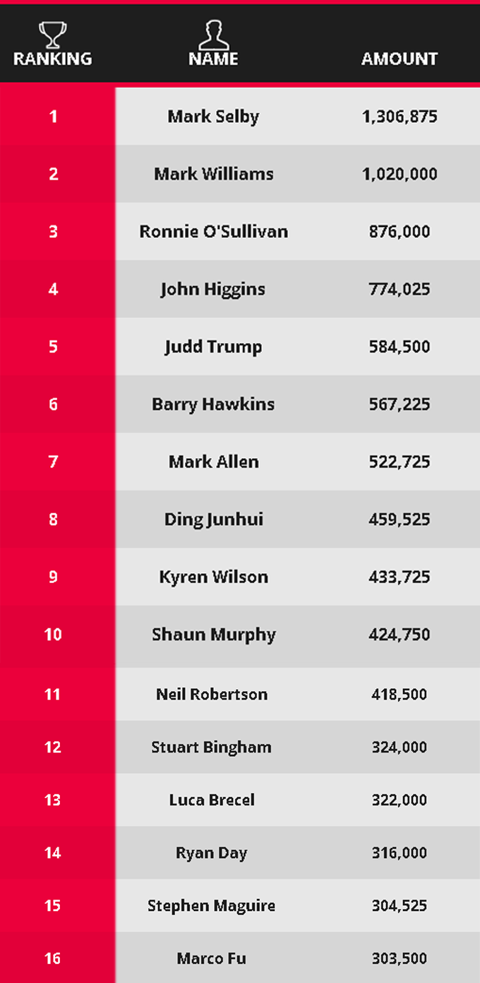อย่างไรก็ตามท็อป 16 อันดับแรกของโลกที่ได้สิทธิ์แข่งขันจะการันตีรับเงินรางวัลกันทุกคนแน่นอน โดยผู้ตกรอบ 16 คนจะได้เงิน 12,500 ปอนด์ ราว 525,000 บาท ตกรอบ 8 คน รับ 1,050,000 บาท ตกรอบ 4 คน ได้ 2,100,000 บาท รองแชมป์รับราว 3,780,000 บาท