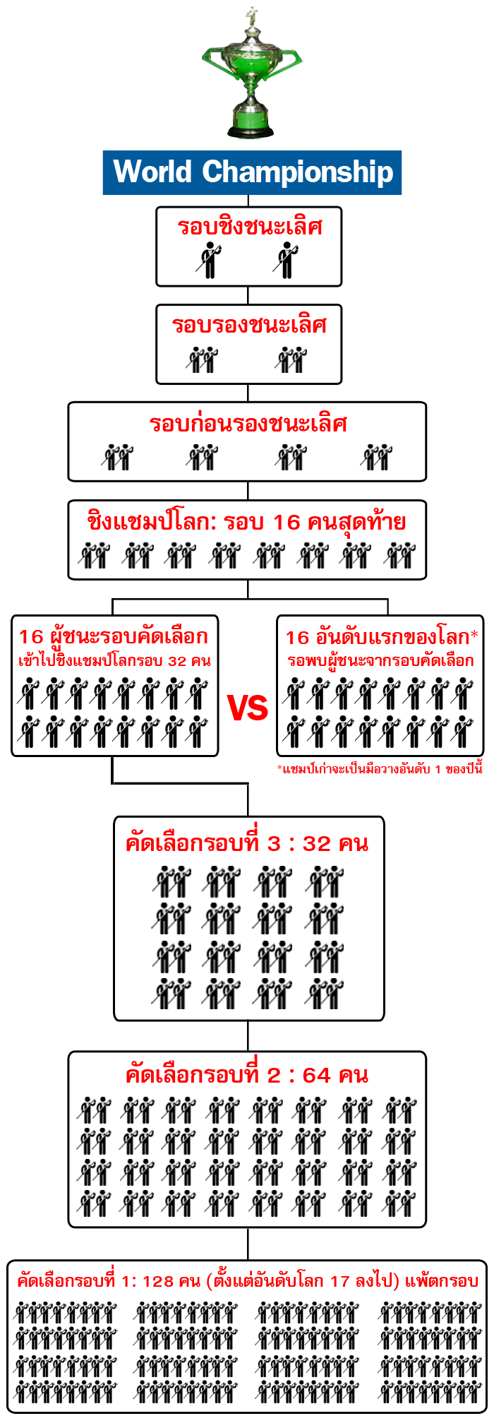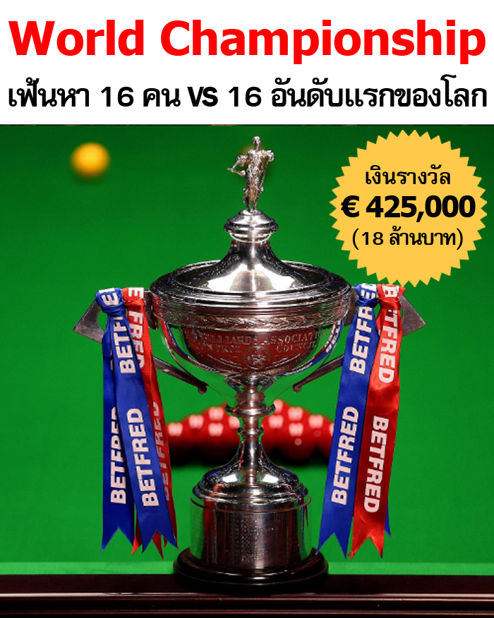 สนุกเกอร์ชิงแชมเป์โลก (World Snooker Championship) รายการใหญ่ที่สุดแห่งปี (เริ่มแข่ง 21 เม.ย.-6 พ.ค. 62) จัดขึ้นครั้งแรกในปี 1927 โดยในรอบคัดเลือกจะเฟ้นหานักสอยคิวที่ติดอันดับโลกตั้งแต่อันดับ 17 ลงไปถึงอันดับ 128 รวมถึงมีโควต้าพิเศษที่จะเรียกนักสนุกเกอร์สมัครเล่นมาเพิ่มอีก 16 คน โดยจะถูกพิจารณาและเชิญมาแข่งขันโดย สมาคมบิลเลียดและสนุกเกอร์อาชีพโลก เพื่อให้ครบ 128 คน ในการคัดเลือกรอบแรก และจะจับฉลากแบ่งสาย แข่งขันกันในระบบ 10 ใน 19 เฟรม แพ้ตกรอบผู้เล่นต้องชนะให้ได้ทั้ง 3 แมตช์ เพื่อเป็นหนึ่งใน 16 คน จะได้ตีตั๋วเข้าไปเล่นในรอบ 32 คนสุดท้าย ไปพบกับมือวาง 16 อันดับแรกของรายการที่ได้สิทธิ์เข้ารอบสุดท้ายโดยอัตโนมัติไปก่อนแล้ว สำหรับแชมป์ของปีที่แล้วจะถูกวางให้เป็นมือวางอันดับ 1 ในปีนี้ ส่วนมือวางอันดับ 2-16 ของรายการ จะอ้างอิงจากอันดับโลกล่าสุด (world ranking) หลังจบรายการ China Open 2019 ช่วงต้นเดือน เม.ย. 2561 นั่นเอง