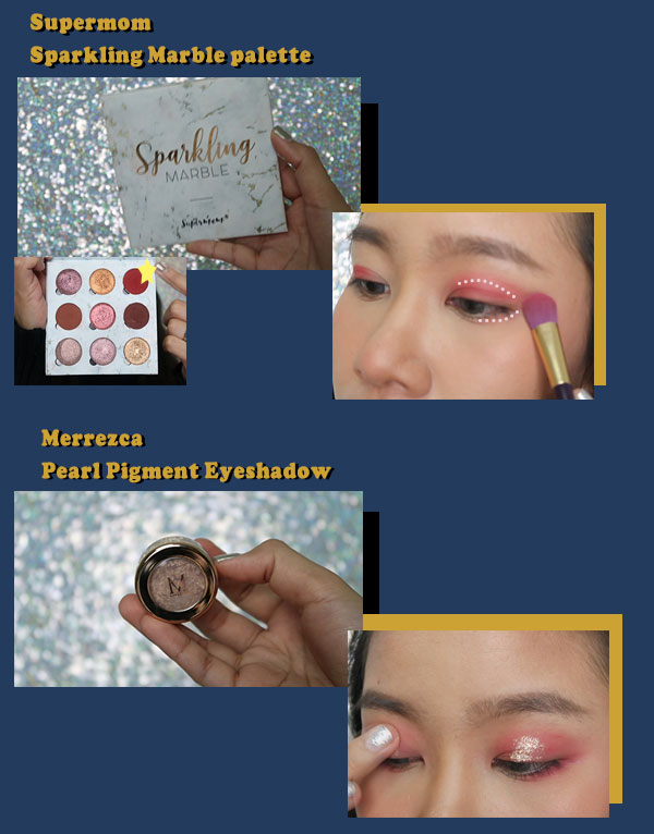 มาในส่วนของการแต่งตากันบ้าง ง่ายแสนง่ายใช้แค่ 2 สีเท่านั้นเอง เริ่มแรกใช้สีแดงทาาให้ทั่วเปลือกตาบนและไล่มาบริเวณขอบตาล่างด้วย (จากหางตาถึงกึ่งกลางตาพอนะคะ) ค่อยๆแตะสีทีละนิดแล้วค่อยๆเบลนจากล่างขึ้นบน ก็จะได้สีที่ไล่ขึ้นเรื่อยๆ จากนั้นใช้กลิตเตอร์สีทองของ Merrezca แตะไปบริเวณกลางตาแล้วค่อยใช้นิ้วเกลี่ยให้เนียน
