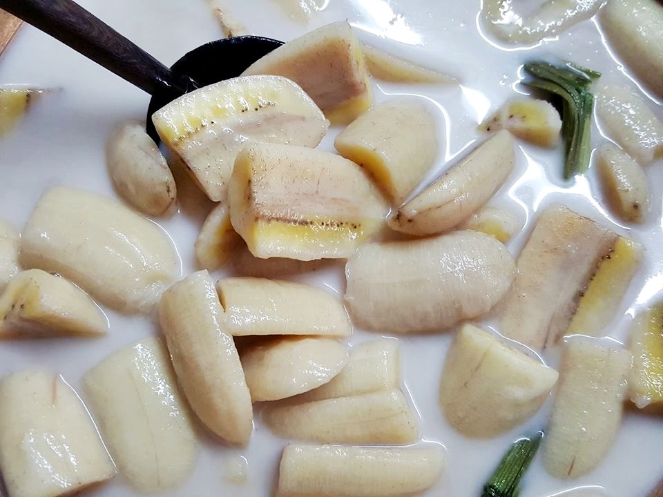 ใส่กล้วยที่หั่นเตรียมไว้ลงไปต้ม (ต้มกล้วยนานประมาณ 8 - 10 นาที)