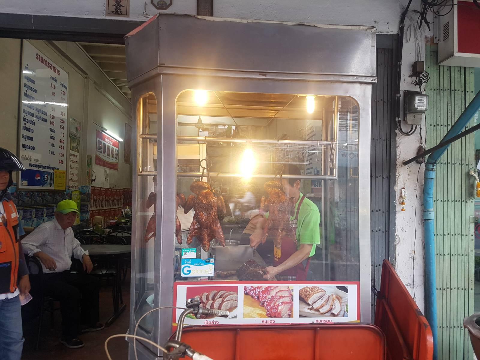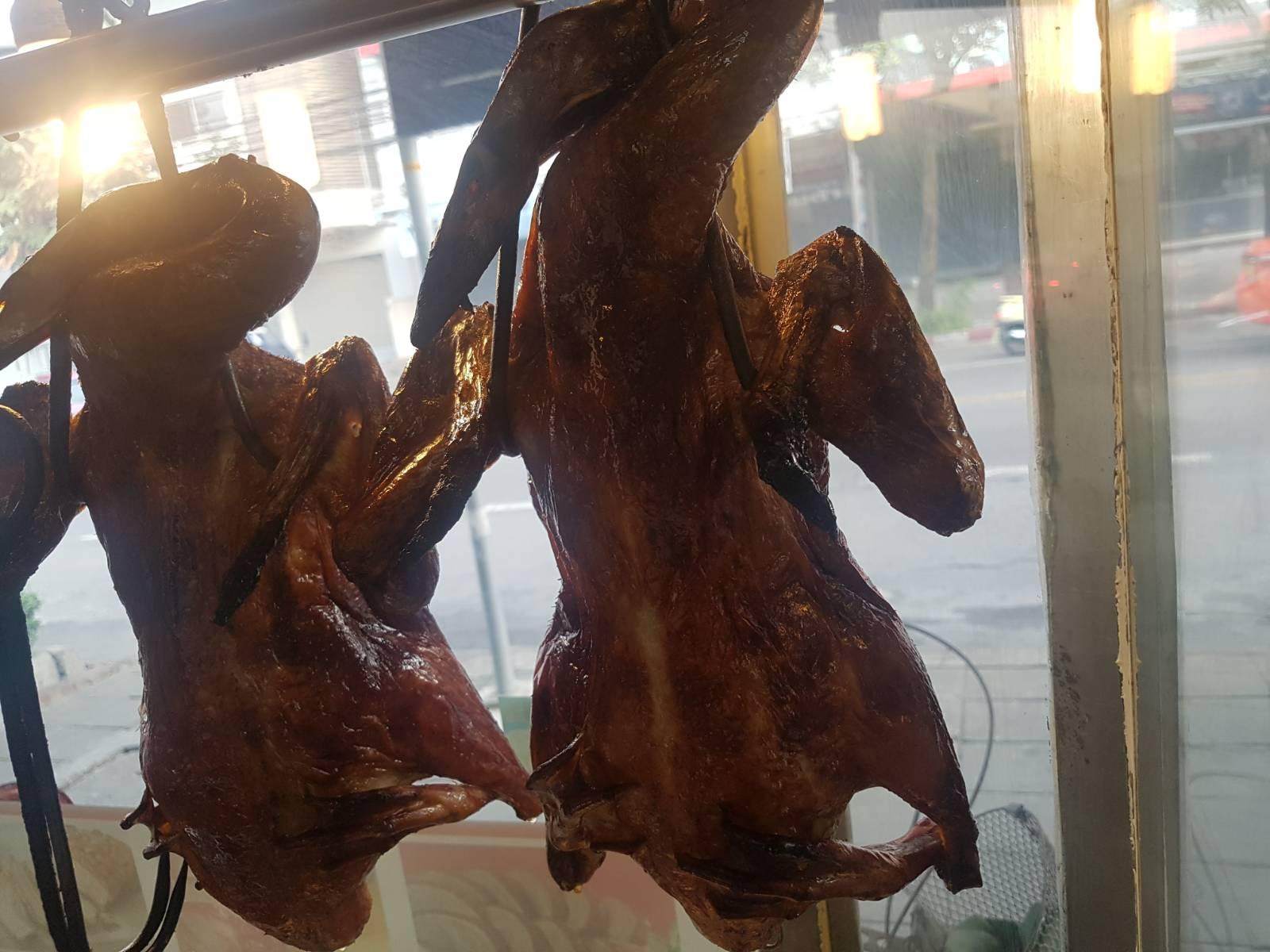 วันนี้ตั้งใจตื่นแต่เช้าเพื่อมาแถบถนนจันทน์ซื้ออาหารใต้ร้านดัง(ไว้มาลง มาเช้าเพราะร้านใต้ลงกับข้าวปุ้ปหมดปั้บคิวยาวตื่นสาย อดกิน!) เดินผ่านร้านนี้ เรดาห์ความตะกละก็กระตุก กลิ่นหอมจากการย่างเป็ดย่าง และหมูแดงโชยมา เดินเข้าไปในร้าน มีอาเจ็ก อาอี้ อาม่า สามคนช่วยกันทำ ทำกันเองในบ้าน สูตรโบราณ