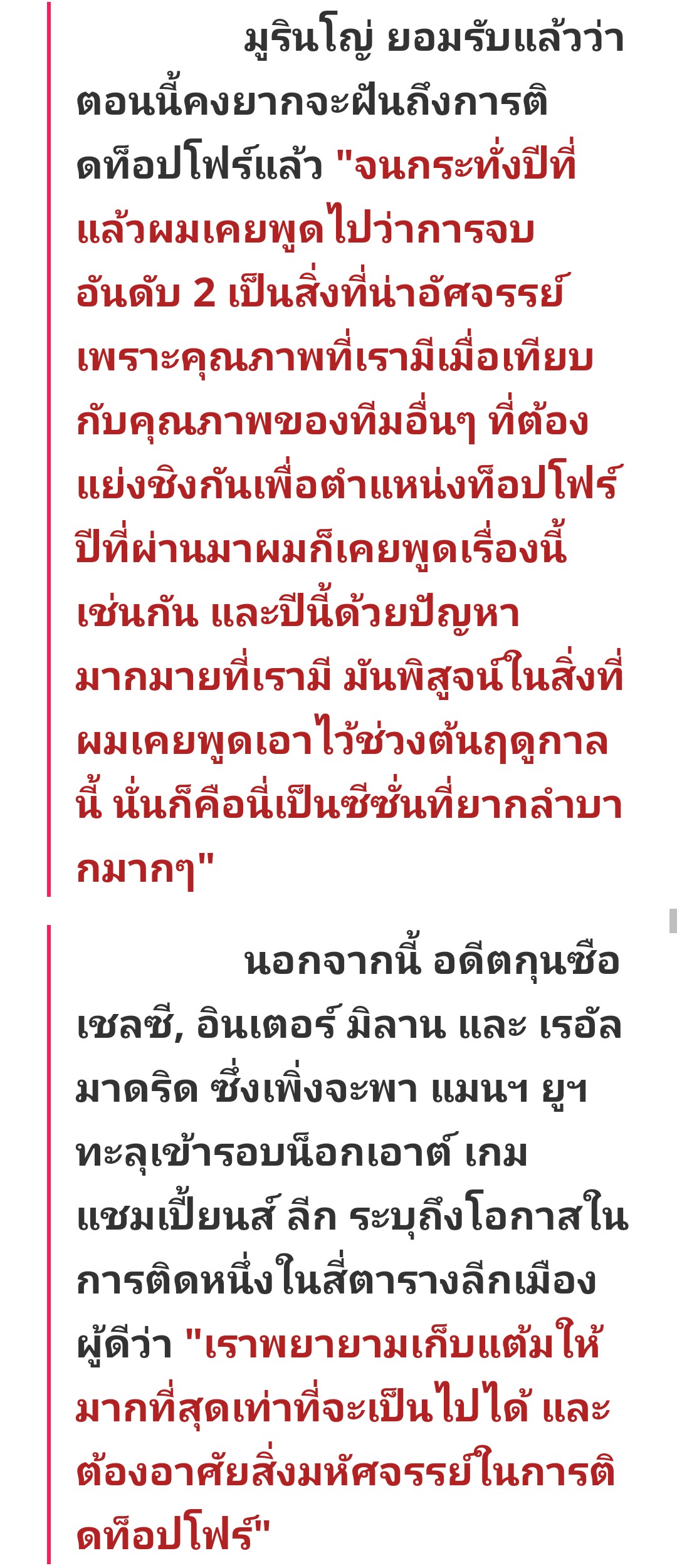 มูเป็นกุนซือฉลาดพูด มีอีคิว จิตวิทยาระดับต้นๆของโลก ล่าสุดยอมรับแล้วว่าคงเป็นได้แค่ฝัน คงเป็นเรื่องมหัศจรรย์ถ้าเราจะจบในท็อปโฟร์ เพราะคู่แข่งแต่ละทีมแข็งแกร่งเหลือเกิน แต้มบุญมานอูคงไม่ถึง แฟนมานอูหยุดเฮฮา กิ๊บก๊าบหน้าบอร์ดได้แล้ว ช่วยกันสวดมนต์ตั้งจิตให้มั่นดีกว่า