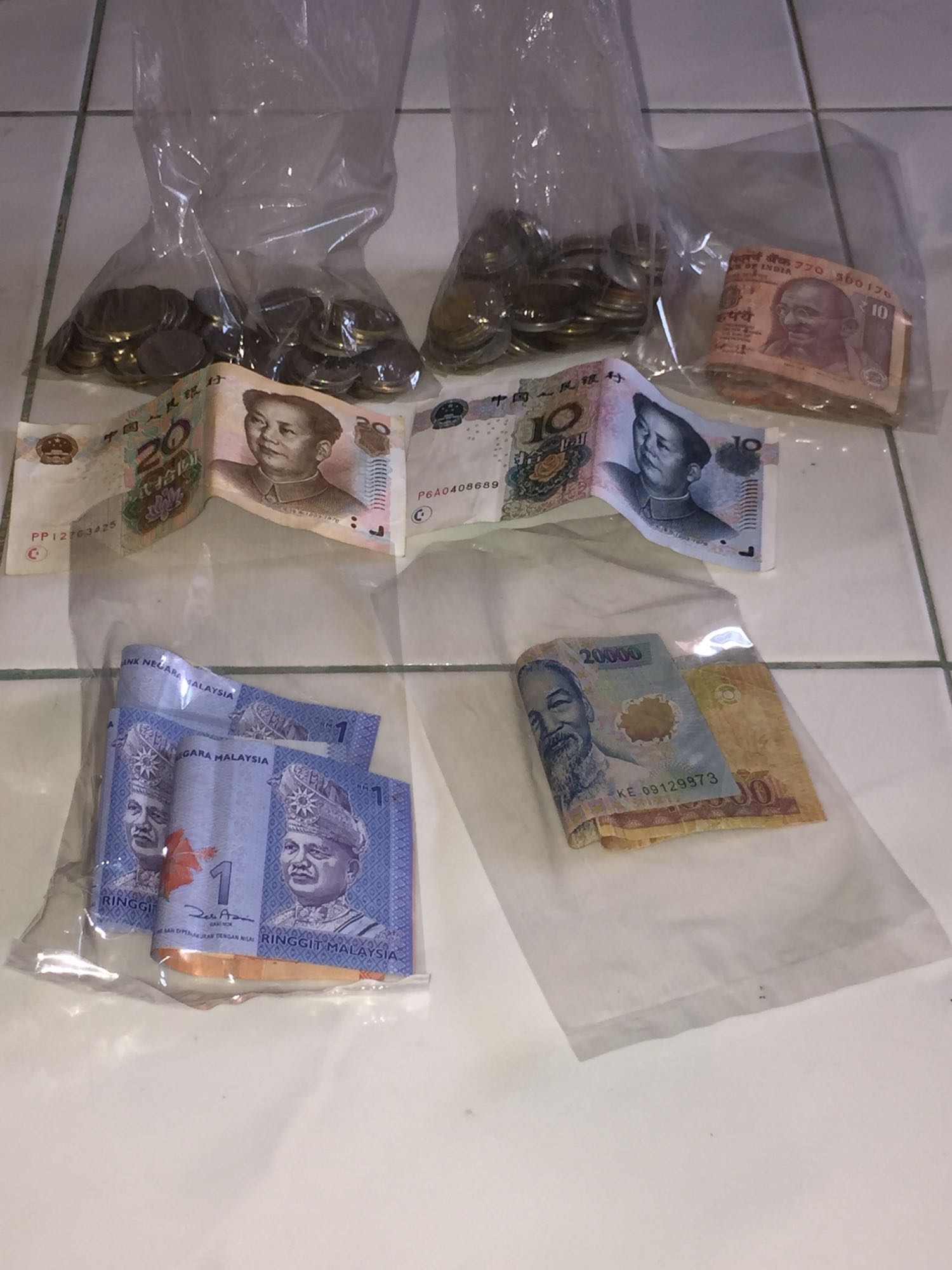มีแบงค์ต่างประเทศ จำนวนหนึ่งครับ ซึ่งสลับคละเคล้ากันไป เช่น แบงค์ของประเทศ จีน อินเดีย มาเลเซีย อินโดนีเซีย ถ้าเอาไปแลก ก็ไม่น่าจะเป็นเงินมากมายแต่อยากให้เกิดปร