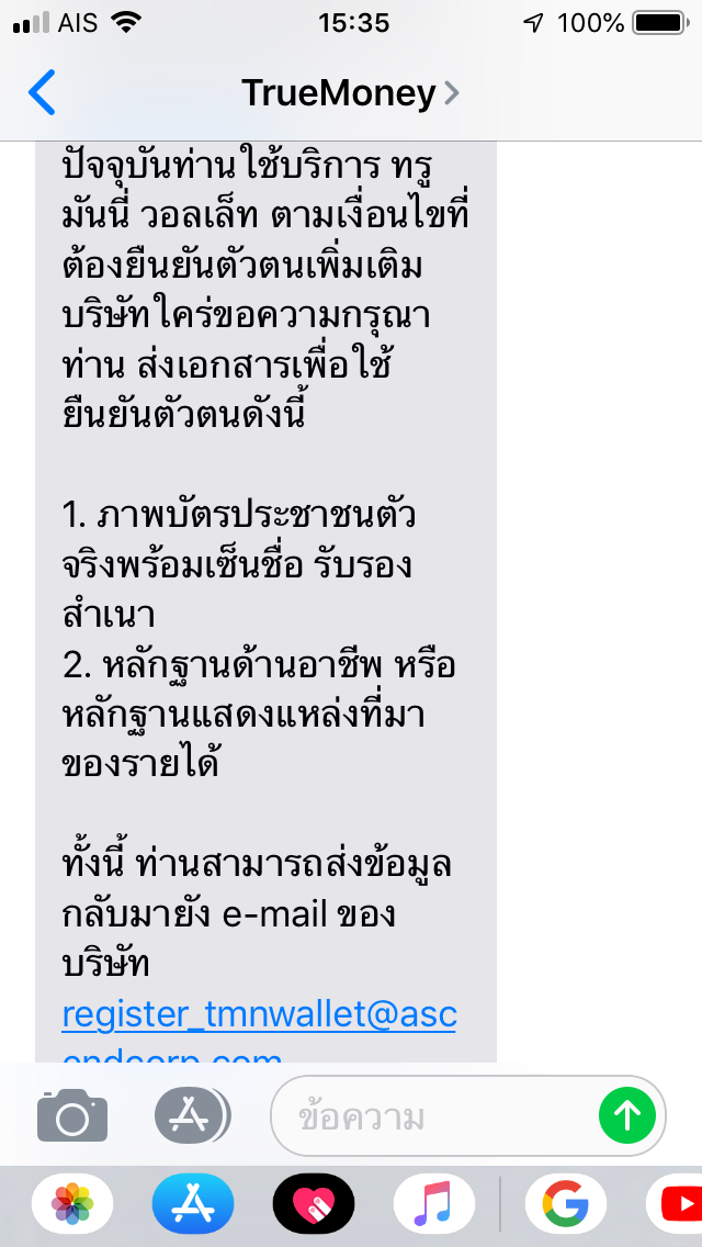 มีข้อความ sms ส่งมาจาก TrueMoney ว่าให้เรายืนยันตัวตน โดยต้องส่งอีเมล์เอกสาร 1.ภาพบัตรประชาชนตัวจริง เซ็นสำเนาถูกต้อง 2.หลักฐานด้านอาชีพ หรือหลักฐานแสดงแหล่งที่มาของรายได้ 3.เอกสารประกอบการแสดงตน โดยร