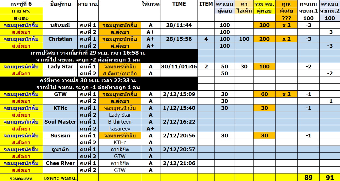 กรรมการยังคงพยายามให้คะแนนลักษณะเดิมอยู่ คือยึด TIMELINE แต่พอมาเป็นกระทู้รวม การติดตาม TIMELINE นั้น ทำได้ลำบากครับ ดังนั้น ใครที่ตอบก่อนในกระทู้ กรรมการก็จะเก็บคำตอบพร้อมทั้งเวลาไว้ก่อน พอไปถึงกระทู้รวม ต้องขอสารภาพว่า "เก็บได้บ้าง ไม่ได้บ้าง" ครับ ก็พยายามทำอย่างดีที่สุดแล้วหละครับผม...