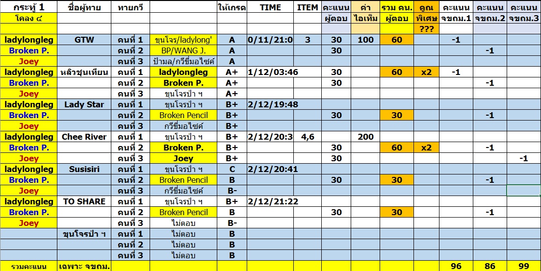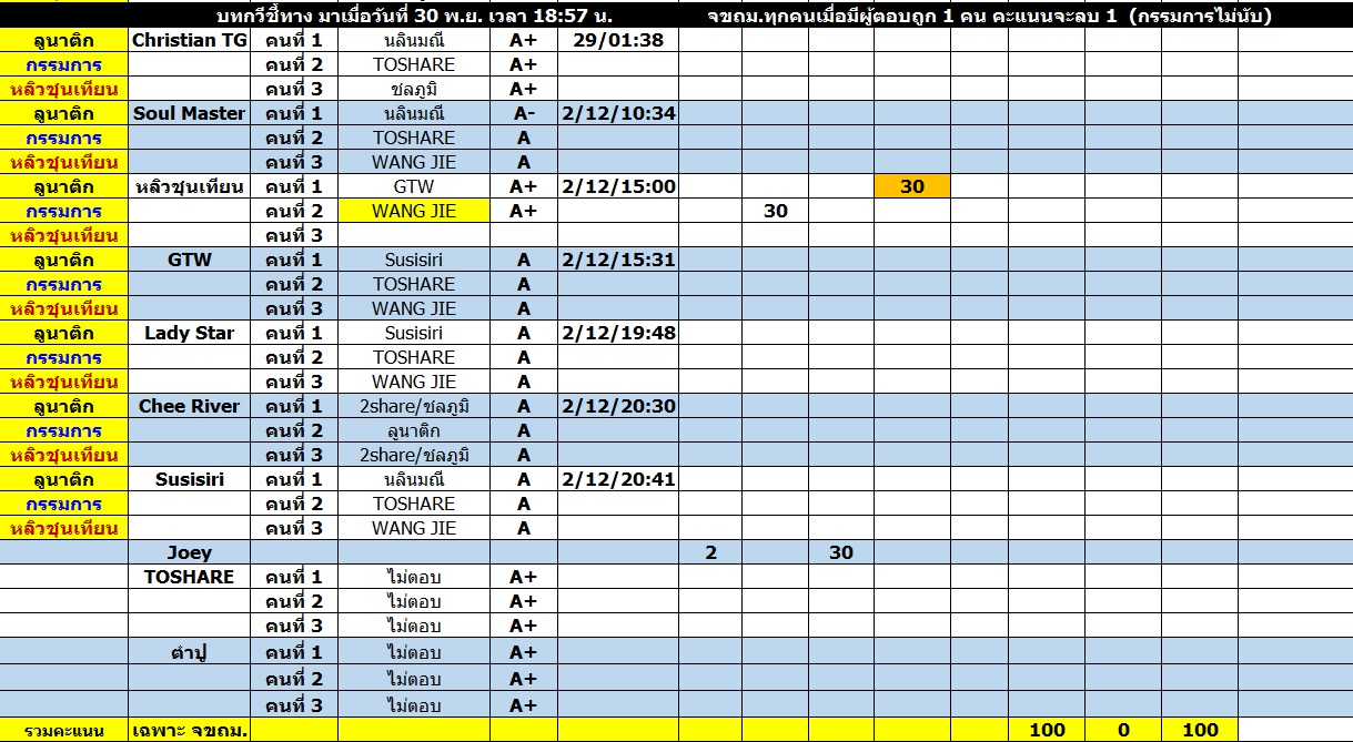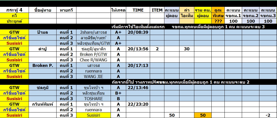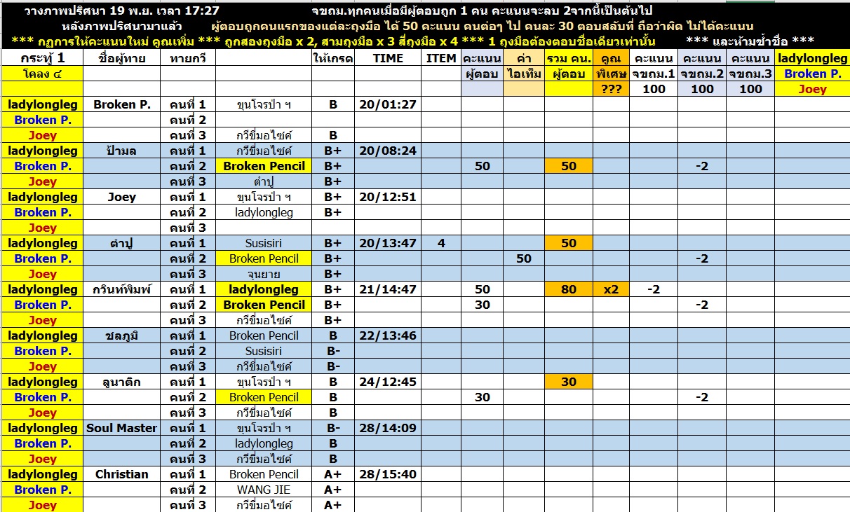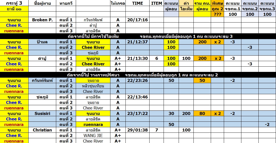 กรรมการยังคงพยายามให้คะแนนลักษณะเดิมอยู่ คือยึด TIMELINE แต่พอมาเป็นกระทู้รวม การติดตาม TIMELINE นั้น ทำได้ลำบากครับ ดังนั้น ใครที่ตอบก่อนในกระทู้ กรรมการก็จะเก็บคำตอบพร้อมทั้งเวลาไว้ก่อน พอไปถึงกระทู้รวม ต้องขอสารภาพว่า "เก็บได้บ้าง ไม่ได้บ้าง" ครับ ก็พยายามทำอย่างดีที่สุดแล้วหละครับผม...