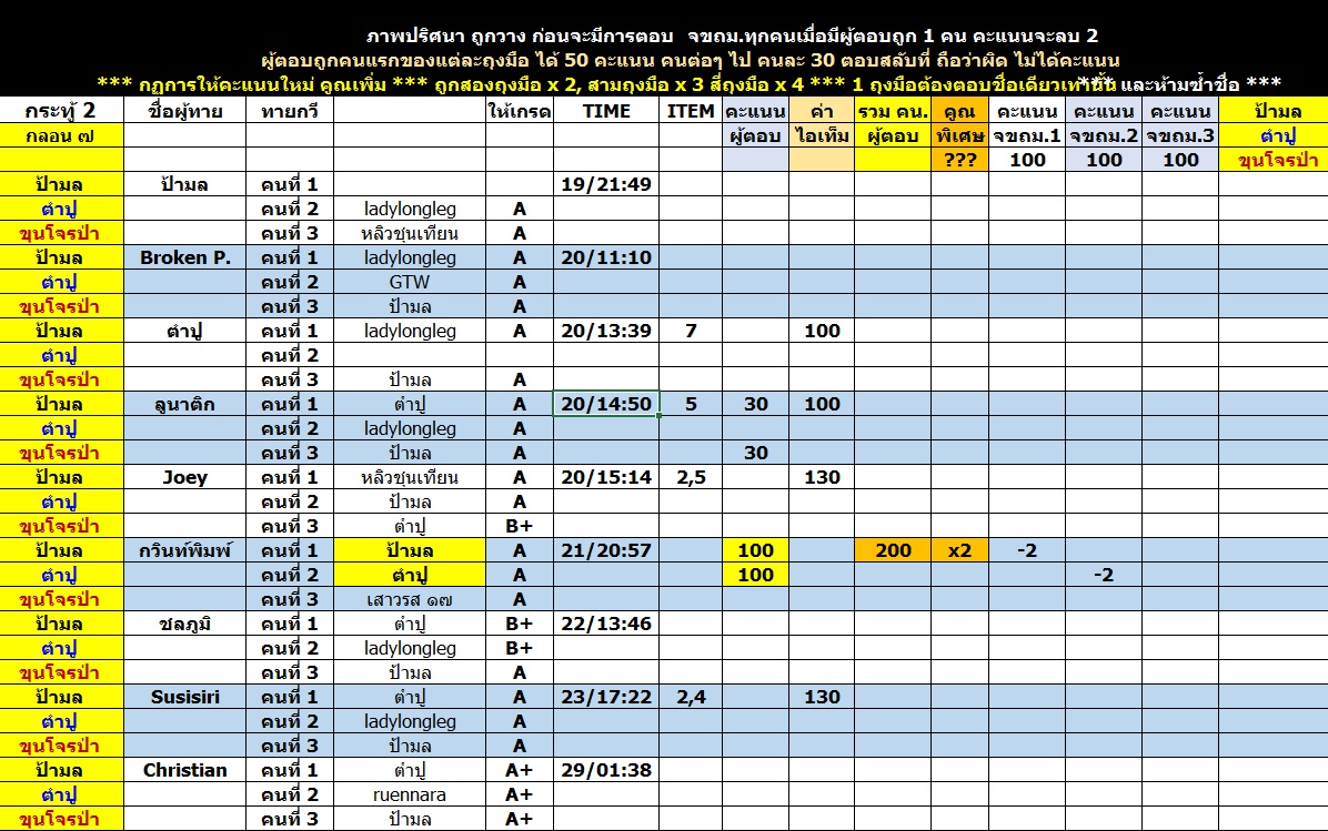 กรรมการ ยังยึดกติกาเดิมเป็นพื้นฐาน คือ ตั้งต้นให้ทุกท่าน มีคะแนนคนละ 100 คะแนน จากนั้น มีการเปลี่ยนแปลงเล็กน้อย คือ จากเดิมที่ถ้ามีคนตอบถูก ก่อนจะมีใครใช้ไอเท็ม และก่อนหน้าภาพปริศนาจะถูกวางในกระทู้ คนทายถูก 1 คน ท่านถูกหัก 5 แต้ม เปลี่ยนเป็นแค่ 3 แต้มพอครับ...และหลังจากวางภาพปริศนาแล้ว แต่ยังไม่ได้วางบทกวีชี้ทาง ถ้ามีใครทายท่านถูก 1 คน ท่านจะถูกหัก 2 แต้ม...และ สุดท้าย หลังจากวางบทกวีชี้ทางแล้ว ถ้ามีคนทายท่านถูก 1 คน ท่านก็จะถูกหัก เพียงแต้มเดียว...อันนี้คือที่มาของ "