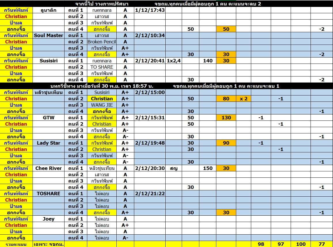 แต่ถ้ากลุ่มแรกข้างบนมีคนตอบถูก แม้แต่คนเดียว คนที่ถูกในกลุ่มหลังนี้ ให้คนแรก 50 คะแนน (มีคนเดียวก็ 50 คะแนน) คนต่อๆ ไป คนละ 30 คะแนน