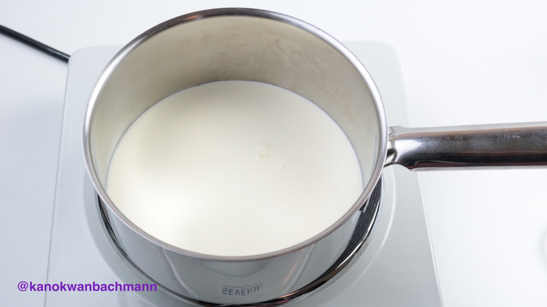 1. ตั้งหม้อใบที่ 1 บนเตาไฟ เปิดไฟร้อนปานกลาง เทวิปปิ้งครีมลงไป ต้มจนกระทั่งวิปปิ้งครีมเดือด เบาไฟลงเล็กน้อยเพื่อไม่ให้วิปปิ้งครีมเดือดจัดจนล้นออกนอกหม้อ ต้มไว้ก่อน