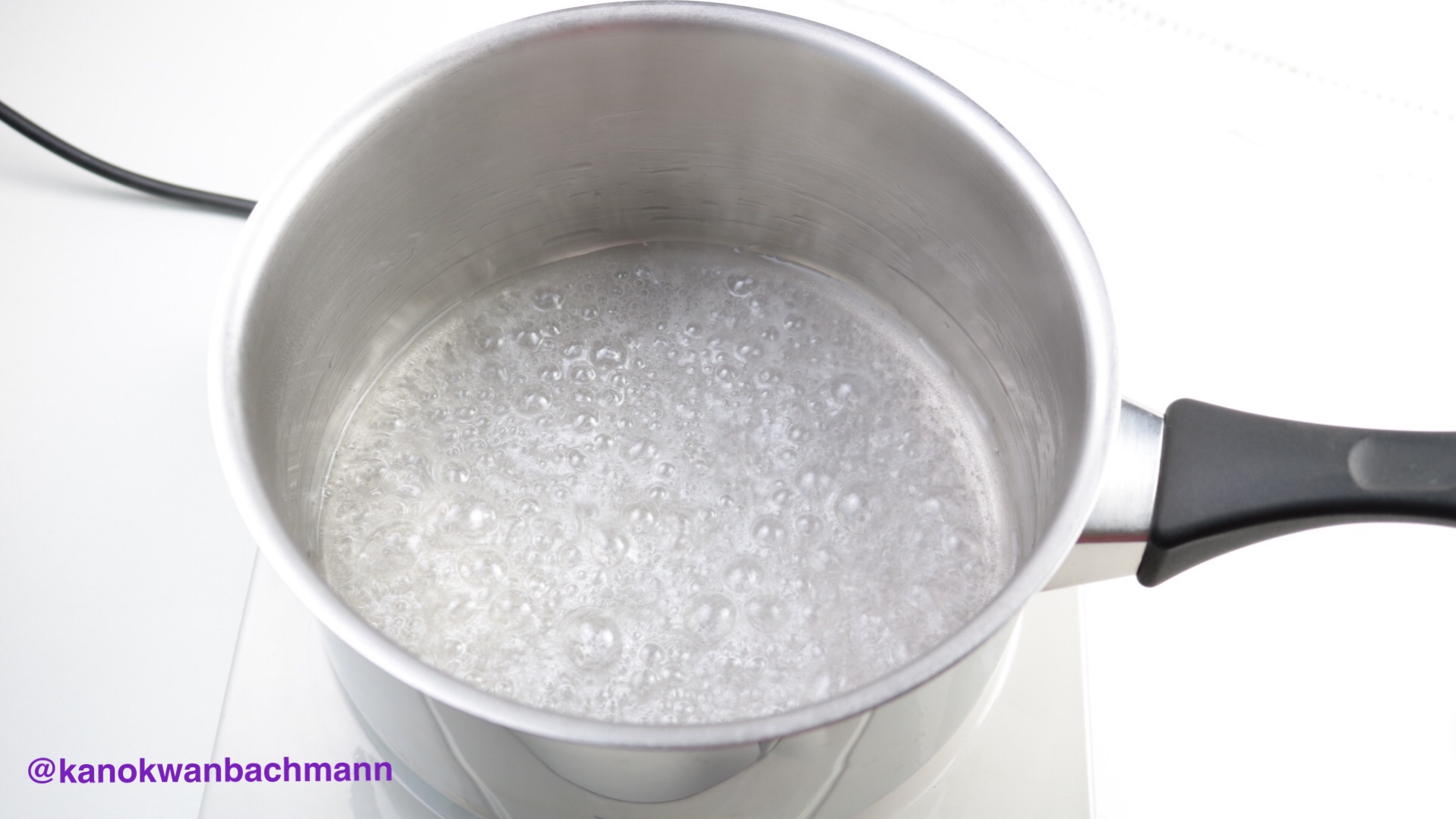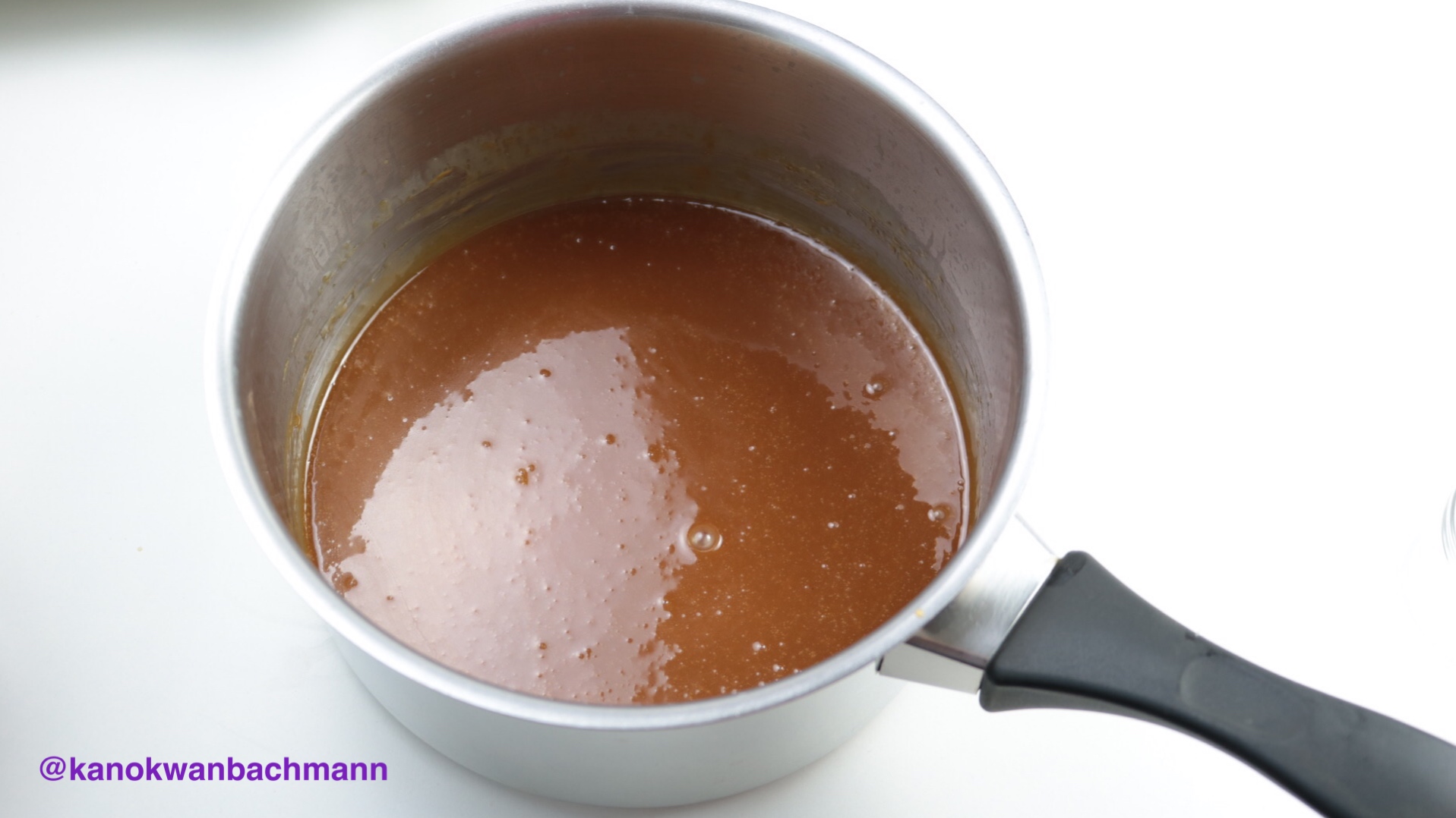 2.ตั้งหม้อใบที่ 2 บนเตาไฟ เปิดไฟร้อนปานกลาง หม้อต้องมีขนาดใหญ่พอสมควร เทน้ำตาลทรายลงไป ตามด้วยน้ำเปล่า ยกหม้อขึ้นเล็กน้อยเอียงไปมาเพื่อให้น้ำกระจายทั่วน้ำตาลทราย ต้มจนกระทั่งสังเกตุเห็นน้ำเดือด