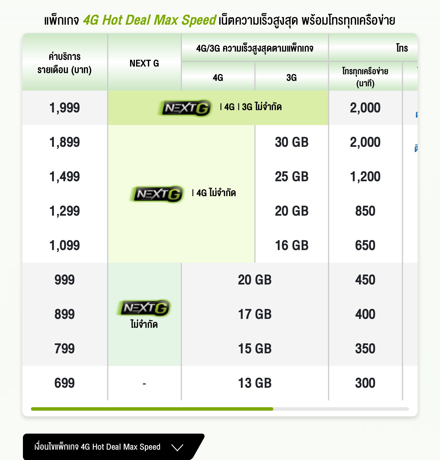 1.ถ้าเราอยากใช้NextG ด้วย ก็ต้องย้ายไปโปร 799ขึ้นไป แต่ในเว็บเห็นมี 699แล้วโดดไป 899เลย มีตัว 799เลยมั้ยคะ