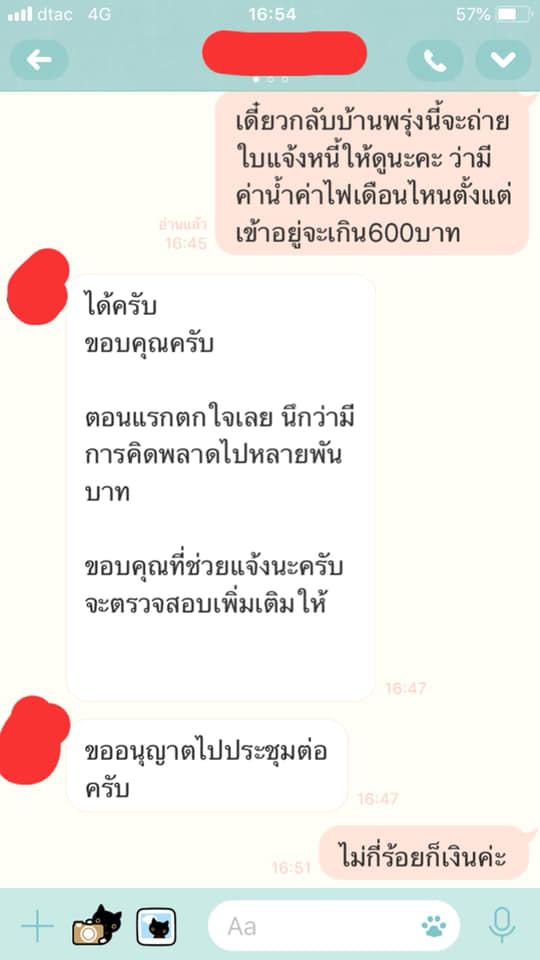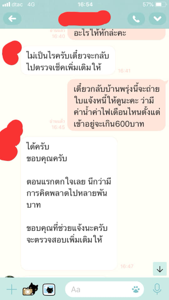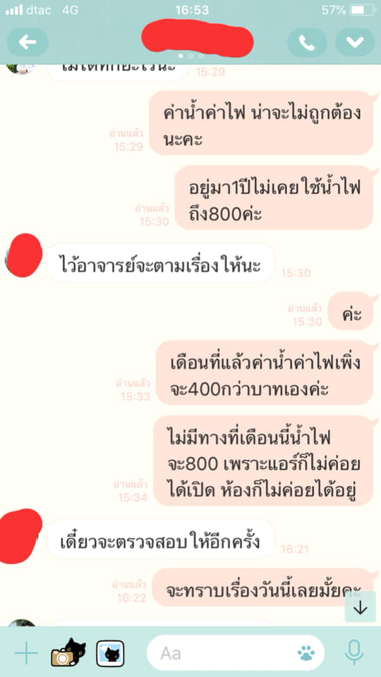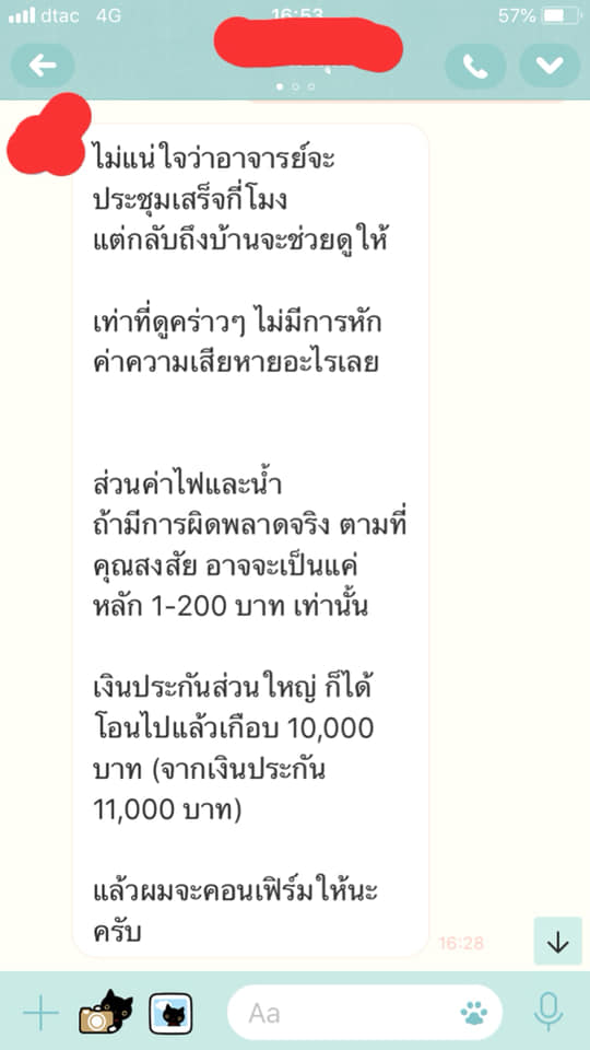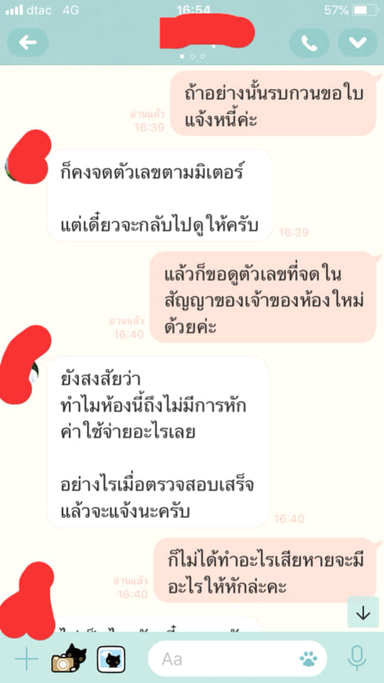 สวัสดีค่ะ วันนี้มีเรื่องอยากจะมาสอบถามทุกคนค่ะ เราเพิ่งย้ายออกจากห้องเก่าในซอยสุขุมวิท101 ที่สามารถเลี้ยงสัตว์ได้ (ไม่เอ่ยชื่อละกันนะคะ) ทุกเดือนเราจ่ายเงินค่าห้องตรงตลอดไม่เคยต้องให้ทวงบางเดือนก็ต้องลงไปถามเองว่าเมื่อไหร่ค่าห้องจะออก พอเราได้ห้องใหม่เราก็ไปแจ้งออกตามปกติ มีการให้เขียนใบเเจ้งออกและในใบแจ้งออกได้ระบุว่าให้ย้ายออกภายในวันที่30 แต่เดือนนี้วันที่30 ตรงกับวันศุกร์เลยขอออกวันที่ 1 แทน ซึ่งก็ไม่มีฟีดแบคกลับมาว่าออกวันที่ 1 ไม่ได้ (เป็นความผิดเราด้วยที่ไม่สื่อสารกับคนดูแลห้องให้ดี) ซึ่งเราก็ได้ทำการจองรถขนของไว้เรียบร้อยแล้ว จนกระทั่งวันที่ 28 ทางเจ้าของห้องโทรมาแจ้งว่าต้องให้เราขนของออกภายในวันที่ 30 เท่านั้น เพราะลูกค้าใหม่จะเข้าห้องวันที่ 1 ช่วงเช้า ทำให้แพลนทุกอย่างที่เราวางไว้ต้องเปลี่ยนแบบกระทันหัน ต้องโทรให้ที่บ้านมาช่วยขนส่วนนึง และอีกส่วนนึงต้องจ้างรถขนของใหม่ ยังดีที่ว่าเรายังไม่ได้จ่ายค่ามัดจำรถขนของไปก่อน วันที่30 เราก็ต้องลางานครึ่งวันเพื่อมาย้ายของ ส่วนเงินค่ามัดจำห้องเราต้องรอทางห้องโอนคืนให้วันที่ 7 จนมาถึงวันนี้เราก็รอจนเงินเกือบบ่าย 3 โมง จากที่เจ้าของแจ้งว่าจะโอนก่อนบ่าย2 โมง เพราะเรานัดใช้หนี้ไว้ เราโทรแล้วโทรอีกก็ไม่รับสายจนต้องโทรอีกเบอร์นึงถึงจะได้ค่าห้องคืน แต่!!เรื่องมันไม่ได้จบแค่นั้นเพราะเงินที่โอนคืนมามันไม่ได้ตามที่เราประมาณการไว้ตั้งแต่ทีแรก (คนอยู่หอจะรู้ดีค่ะว่าค่าใช้จ่ายค่าน้ำค่าไฟอยู่ที่ประมาณเท่าไหร่) ซึ่งเงินที่หักจะมาจากค่าทำความทำสะอาดและค่าน้ำค่าไฟ แต่ค่าน้ำค่าไฟที่เราถูกหักมันเกินจากที่ใช้ๆ อยู่ทุกเดือนประมาณเท่าตัวนึง ซึ่งมันเป็นไปไม่ได้เลยที่เราจะใช้เกินขนาดนั้นเพราะเราไม่ค่อยได้อยู่ห้อง กลับบ้านทุกอาทิตย์ กลับถึงก็ 2-3 ทุ่มเกือบทุกวัน เปิดแอร์แค่ช่วงกลับถึงห้องพอก่อนนอนก็ปิดเป็นกิจวัตรแบบนี้ทุกวัน ส่วนค่าน้ำเราก็ใช้แค่อาบน้ำผ้าไม่ซักเพราะเอากลับไปซักที่บ้านตลอดเราจึงรู้ว่าไม่มีทางเลยที่ค่าน้ำค่าไฟจะสูงเท่านี้ เราจึงโทรไปถามกับเจ้าของผู้หญิงแต่ไม่รับจึงไลน์ไปถามเจ้าของผู้ชาย จึงเกิดการสนทนาตามรูปเลยค่ะ เราก็พลาดเองที่ไม่ขอดูมิเตอร์ก่อนย้ายออกเพราะปกติก่อนเราย้ายออกคนดูแลหอจะแจ้งเราเรื่องค่าใช้จ่ายที่เกิดขึ้นพร้อมเงินที่ต้องโอนเงิน ถ้าเรื่องนี้เกิดกับทุกคน ทุกคนจะว่ายังไงคะและเราควรต้องทำยังไงต่อ
