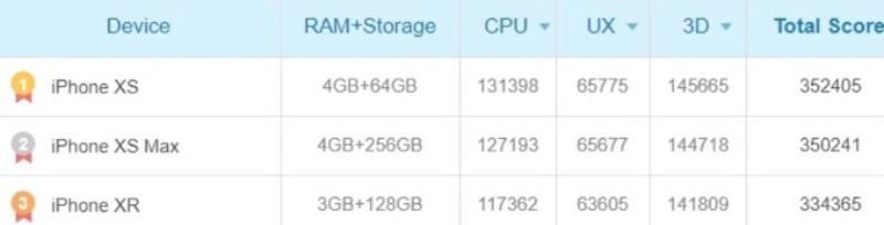 อันดับ 1 ได้แก่ A12 จาก Apple [CPU: 131,398 คะแนน; รวม: 352,405 คะแนน]