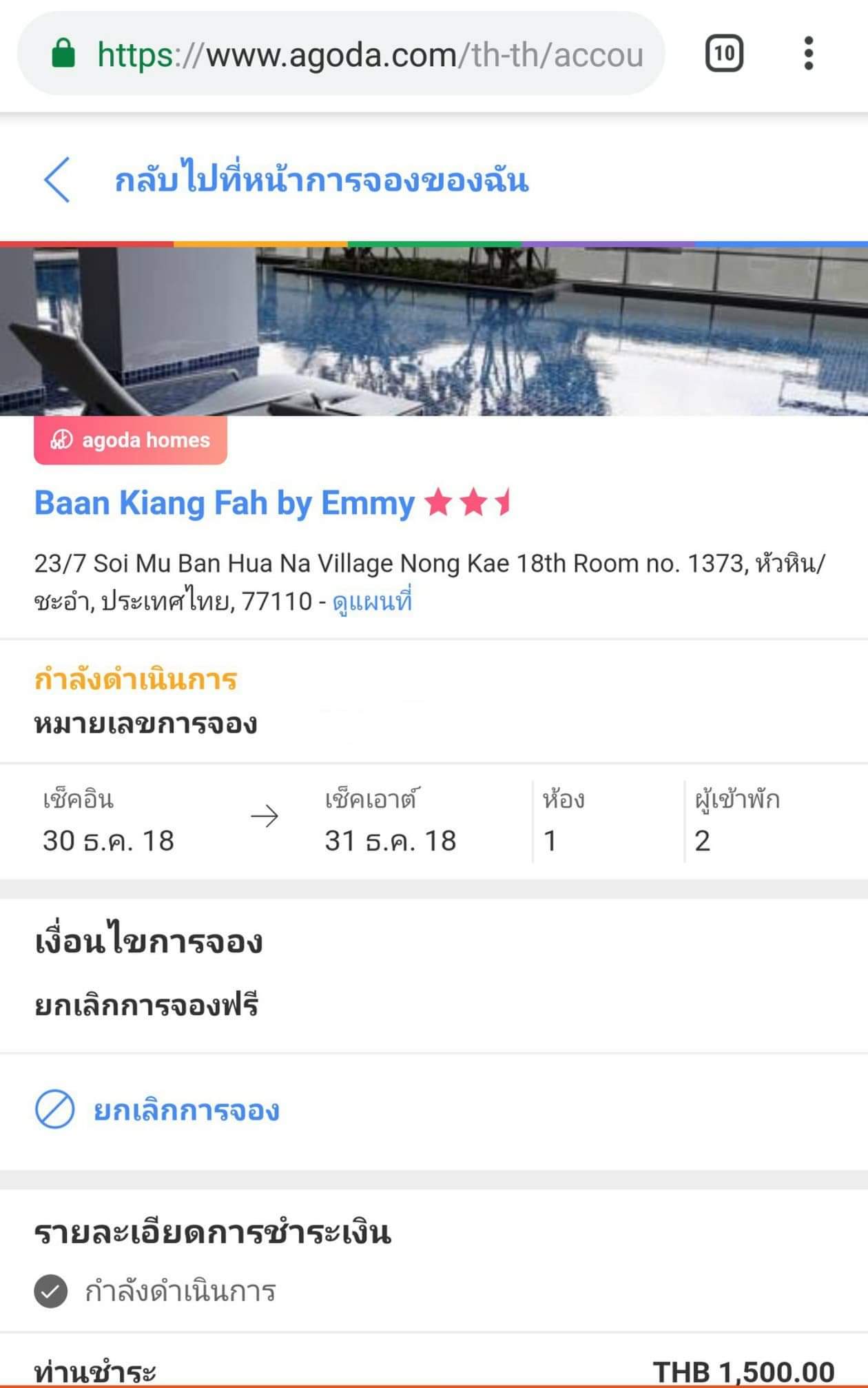 จองที่พักกับagodaประมาณ19.00ของเมื่อวานค่ะ ยังไม่ได้อีเมล์จากagodaเลย แต่ในการจองมันขึ้นว่ากำลังดำเนินการ กับหมายเลขการจองแล้ว ถ้ามันขึ้นแบบนี้แสดงว่า การจองที่พักของเราสำเร็จมั้ยคะ? หรือว่าต้องติดต่อกับagodaเลย เพราะที่พักที่จองไปเป็นการจองแบบจ่าย ณ ที่พัก ค่ะเลยอยากแน่ใจว่าจะได้แน่นอนมั้ย