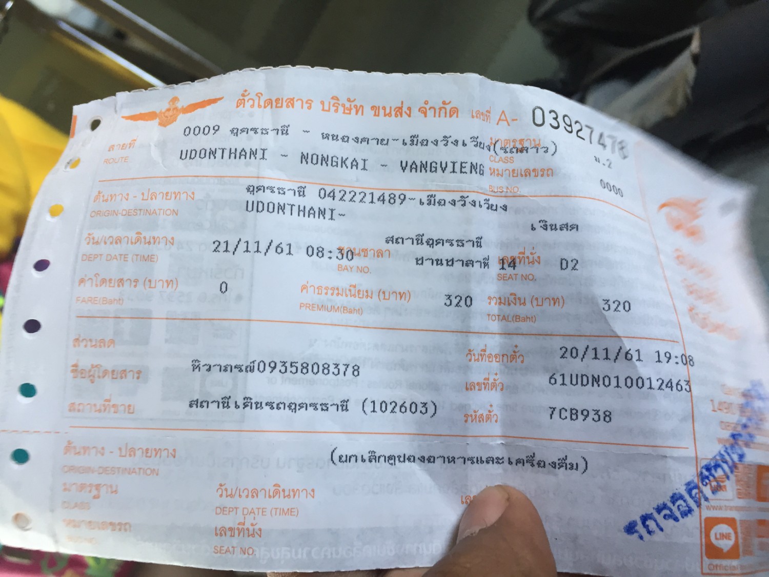 สักพักรถก็มา เราก็เตรียมยื่นตั๋วแล้วขึ้นรถไปวังเวียง พอผู้โดยสารมาพร้อม รถก็ออกเดินทางจาก บขส อุดร มุ่งหน้าสู่ด่านตรวจคนเข้าเมืองที่หนองคายเพื่อข้ามฝั่งไปเวียงจันทร์ สปป.ลาว และมุ่งหน้าไปวังเวียง