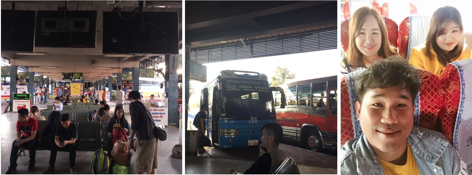 เราและเพื่อนๆ ตื่นกัน 06.00 น. อาบน้ำ แต่งตัวเรียบร้อย และออกมาเช็คเอ้าจากที่พักเพื่อเดินข้ามฝั่งไปรอขึ้นรถที่ บขส. ระหว่างรอรถ มีร้านข้าวต้ม พวกเรากินลองท้องไปก่อนเพราะดูจากเวลาขึ้นรถ 8.30 -14.00 น. ตามแผนเราเลยเตรียมเสบียงไปแน่นมากเพราะเราไม่รู้จะจอดพักที่ไหน ของกินราคาแพงไหม เราเตรียมจากไทยไปดีกว่า พอทำธุระอะไรเรียบร้อยก็มานั่งรอรถที่ บขส ต่อ