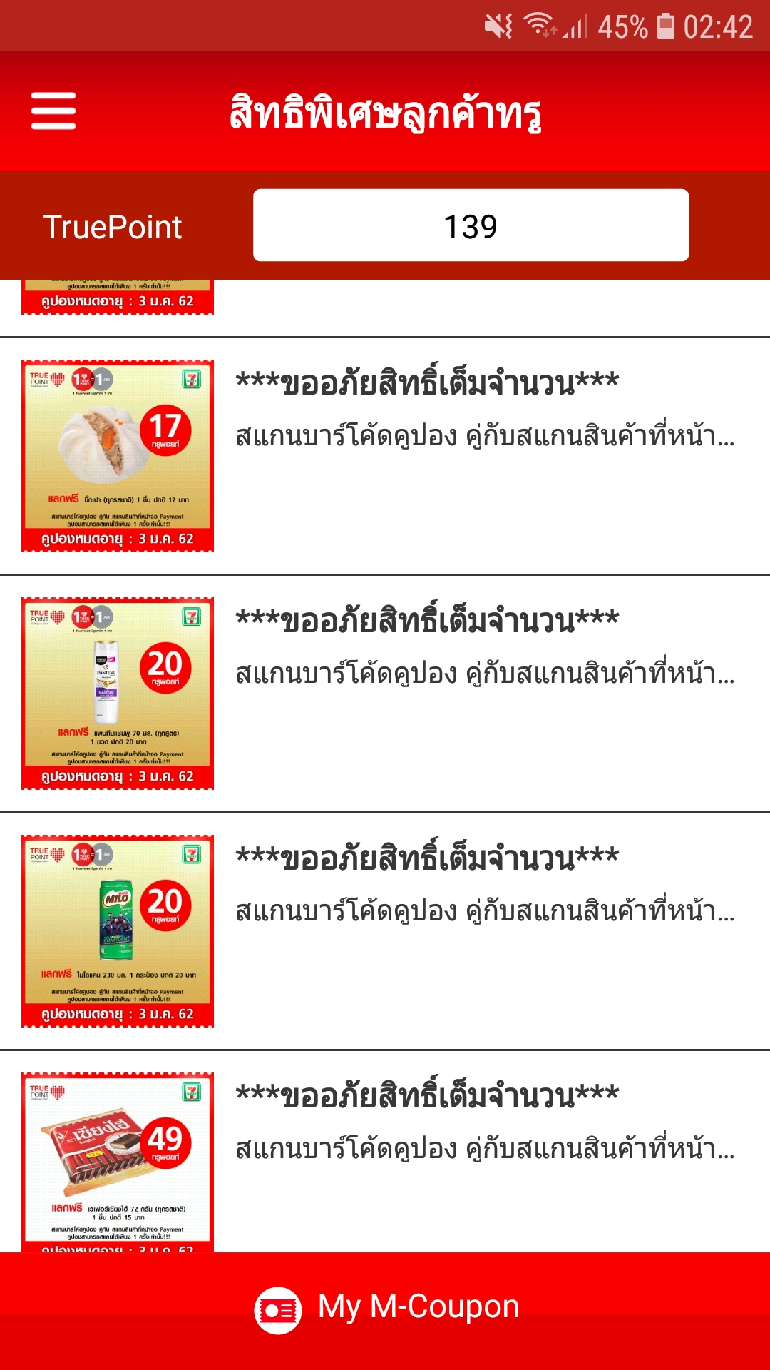 ใช้แต้ม truepoint แลกของสำเร็จ แลกไป 5 สิทธิ์ แต่หาแลกได้แค่1 เพราะของหมดทุก 7-11 คูปองยังไม่ถึงวันหมดอายุ แต่ขึ้นว่า "ขออภัยสิทธิ์เต็ม" ทั้งที่หักแต้ม truepoint ไปแล้ว คูปองนี้ยังใช้ไ