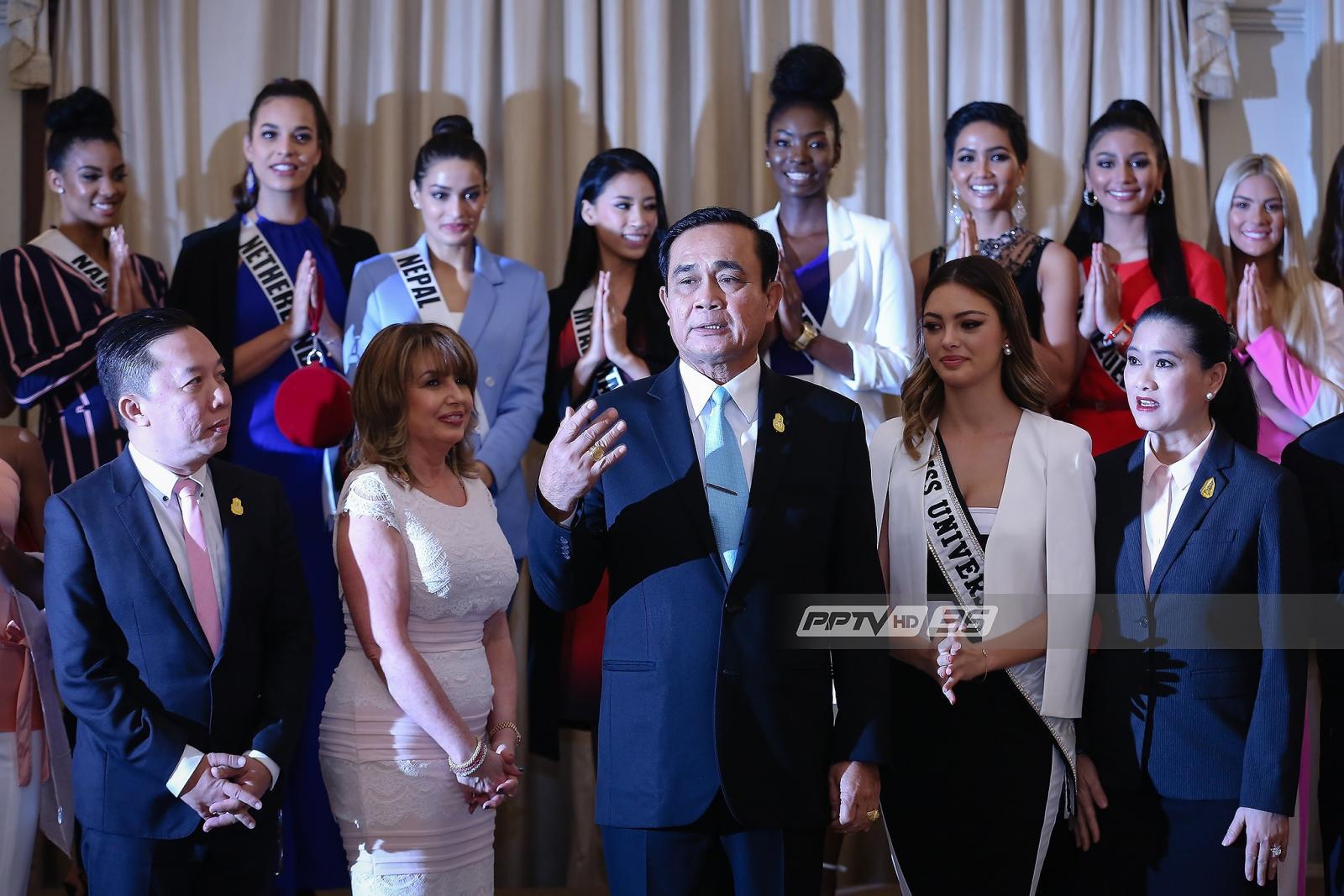 พล.อ.ประยุทธ์ บอกกับนางงามทุกคนว่า ทำเนียบรัฐบาลวันนี้รู้สึกสว่างสดใสด้วยความงามของทุกคน และทราบว่าในช่วงหลายวันที่ผ่านมาทุกคนเหน็ดเหนื่อยกับการเดินทาง ซึ่งการเดินทางมาประเทศไทยครั้งนี้ถือว่ามาในช่วงเวลาที่เหมาะสม ทั้งช่วงใกล้ในวันคริสต์มาส และวันปีใหม่ของไทย