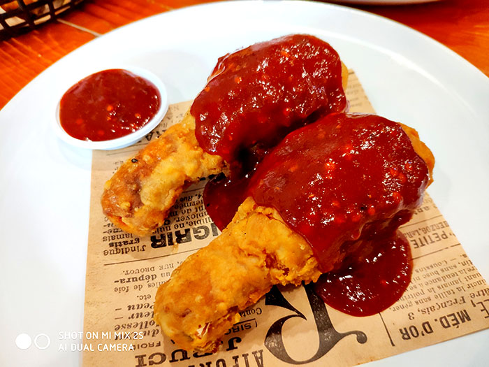 มาแล้วจานที่ผมอยากลองไก่เผ็ด99บาท เป็นน่องนะครับชิ้นใหญ่กว่าไก่ทอดเจ้าดังพอสมควรซอสนี้เผ็ดนำตามด้วยเปรี้ยวหวานสำหรับคนกินส้มตำใส่พริก1เม็ดแบบผมก็เผ็ดจี๊ดจาดดีครับแต่ก็กลมกล่อมถ้าได้กินกับข้าวน่าจะอร่อยมากเลยตัวซอสเผ็ดอร่อยดีครับถือว่าคุ้มราคา