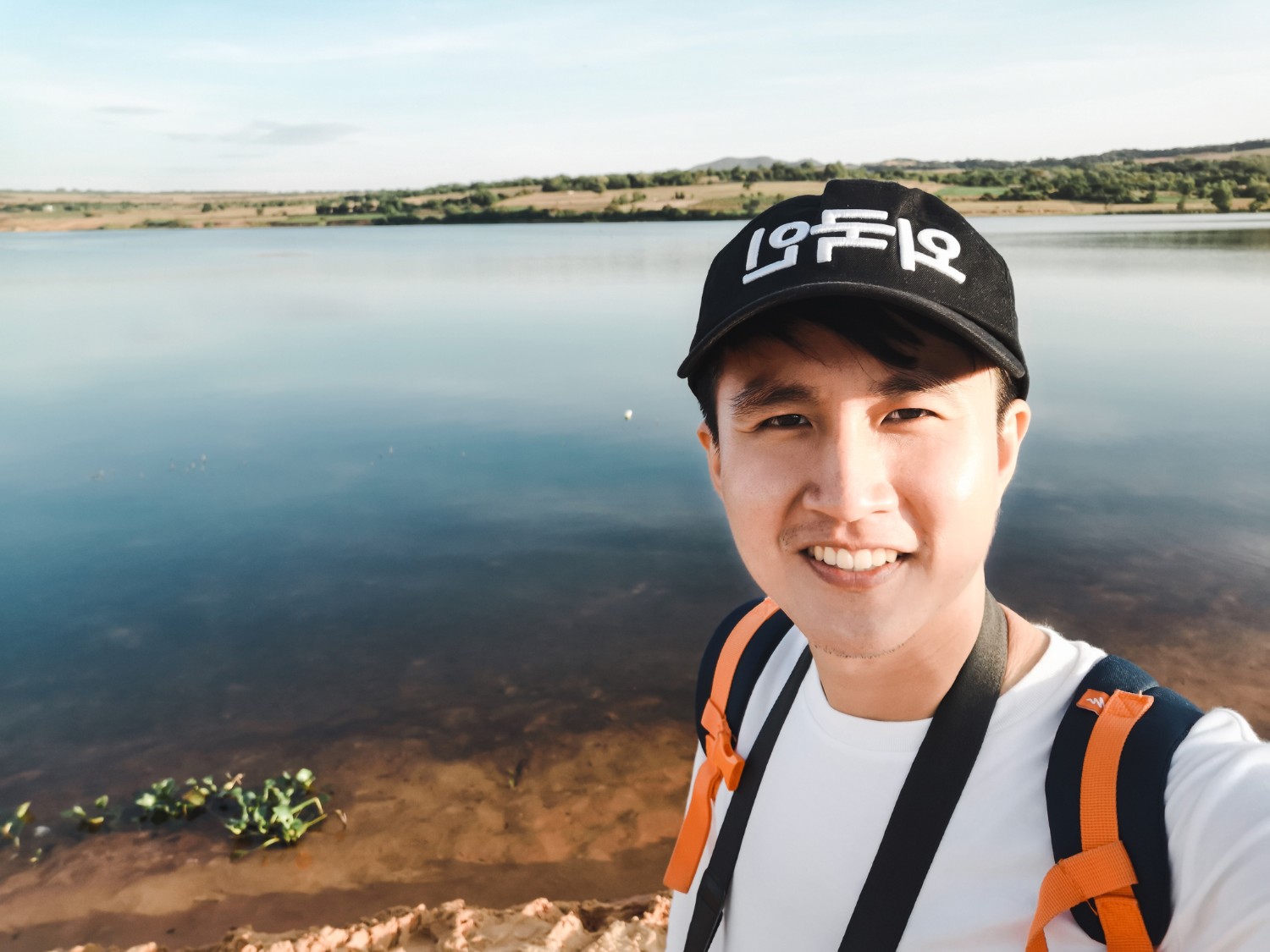พอพระอาทิตย์ขึ้นแล้ว แสงก็สาดส่องมายังเนินทะเลทราย ทำให้ดูมีมิติสวยขึ้นทันตาเลยครับ แถมมีสีท้องฟ้าสีฟ้า และริ้วก้อนเมฆตัดกับสีเหลืองทะเลทรายนี้ดูเข้ากันเลย ขับรถไปอีกหน่อยจะมีแหล่งน้ำทะเลสาบตรงกลางเป็นโอเอซิสด้วยครับ และแล้วก็ลองเซลฟี่ตัวเองสักหน่อย หน้าเนียนเป็นธรรมชาติดีเลย ดูไม่หลอกเกินไป ฮ่าๆ