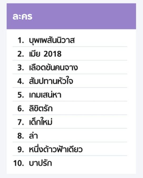ละครปี 2561 (รวมทุกช่อง) ต้องการจะทราบมากมาก ขอ 3 อันดับนะเพคะ 1. 2. 3.