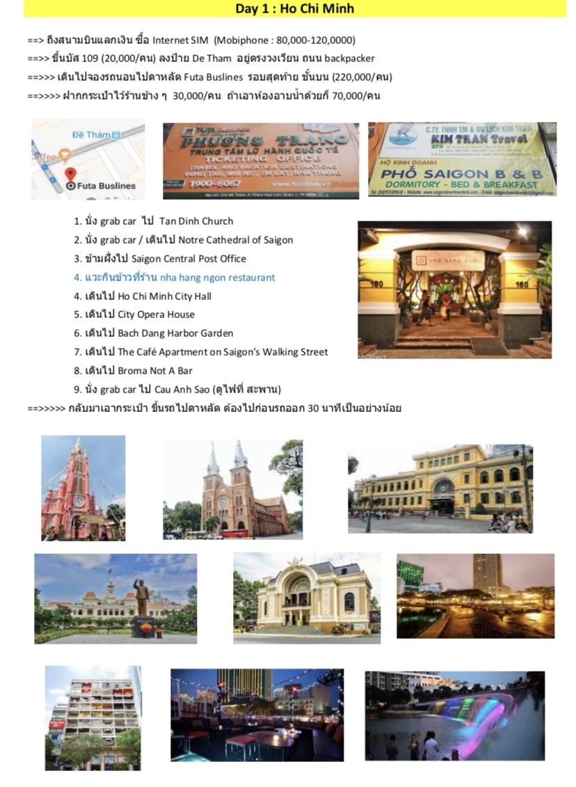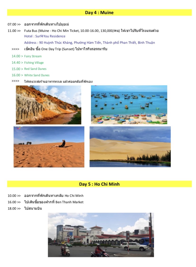 ทริปนี้เป็นทริป 5 วัน 4 คืน (โฮจิมิน - ดาลัท ดาลัท - มุ่ยเน่ - โฮจิมิน) แพลนโดย “หญิงเล็ก” เป็นทริปเน้นไปเก็บสถานที่ต่างๆ เน้นถ่ายรูปมากๆ ค่ะ ไปกันผู้หญิง 4 คน ของกินไม่ได้อยู่ในแพลนนะ จะเดินหาเอา เบี้ยบ้ายรายทางซะส่วนใหญ่ งบคือเก็บกองกลางคนละ 200 USD แลกเป็นเงินดองก็ได้ 18 ล้านกว่าๆ กองกลางนี่ใช้กับค่าโรงแรม ค่ารถ ค่ากินที่กินรวมกัน รวมถึงของฝากที่ 4 คนซื้อเหมือนกันก็จะใช้กองกลางนะคะ ผลก็คือเหลือทอนคนละ 240 THB ค่ะ ตอนกลับ