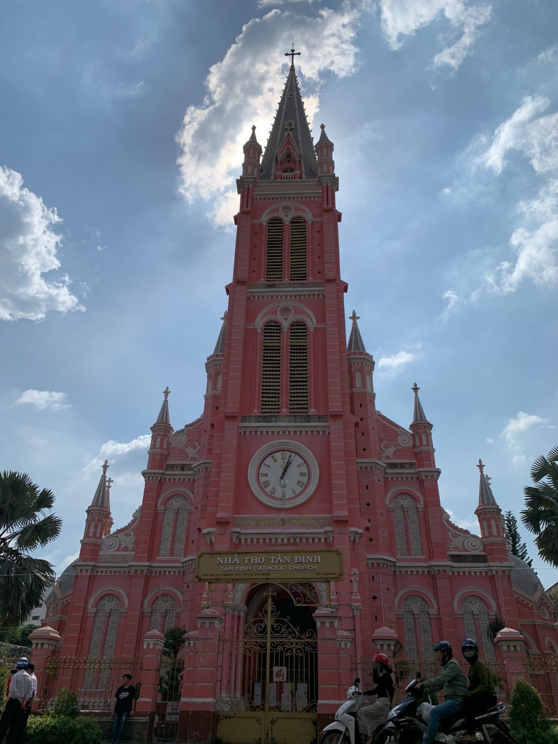 พออิ่มหมีพีมัน ก้อได้เวลาเริ่มเที่ยวจ้า เรียกพี่แกรป ไปที่แรก โบสถ์สีชมพู Tan Dinh Church 200,000 vnd จ้า ไปถึงถ่ายรูปได้แต่ข้างนอกนะเจ้าค่ะ โบสถ์จะไม่เปิดให้เข้าเลยได้ถ่ายรูปแต่จากข้างนอก