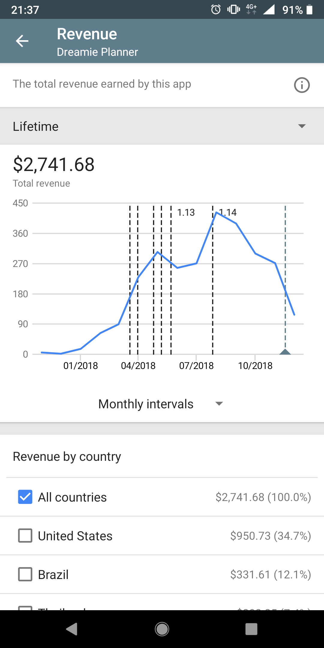 ตอนนี้ยอดขายกับ active user กำลังตกเนื่องจากอัพเดตเวอร์ชั่นล่าสุดแสดง popup disclaimer ว่าจะไม่รับผิดชอบต่อความเสียหายใดๆ ที่เกิดขึ้น ไม่ว่าจะข้อมูลหายหรือโทรศัพท์พัง ซึ่งมีรีวิวนึงให้เรตติ้ง 1 ดาวเพราะเห็น popup นี้ เลยคิดว่าน่าจะเป็นสาเหตุนึงที่ทำให้คนถอนการติดตั้ง บวกกับนานๆ ทีจะมีคนแจ้งมาว่าข้อมูลใน calendar หายซึ่งมีทั้งส่งเมล์มาหาหรือโพสต์รีวิวในสโตร์เลย ซึ่งปัญหานี้ทำตามไม่ได้ สาเหตุเกิดจากอะไรไม่รู้ จะแก้ก็แก้ไม่ได้