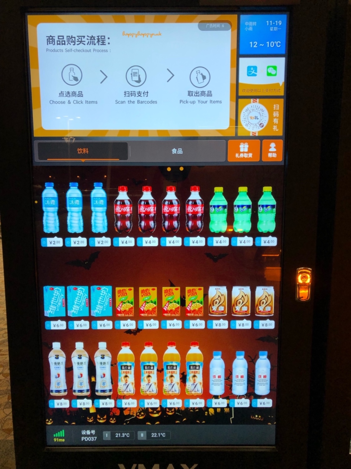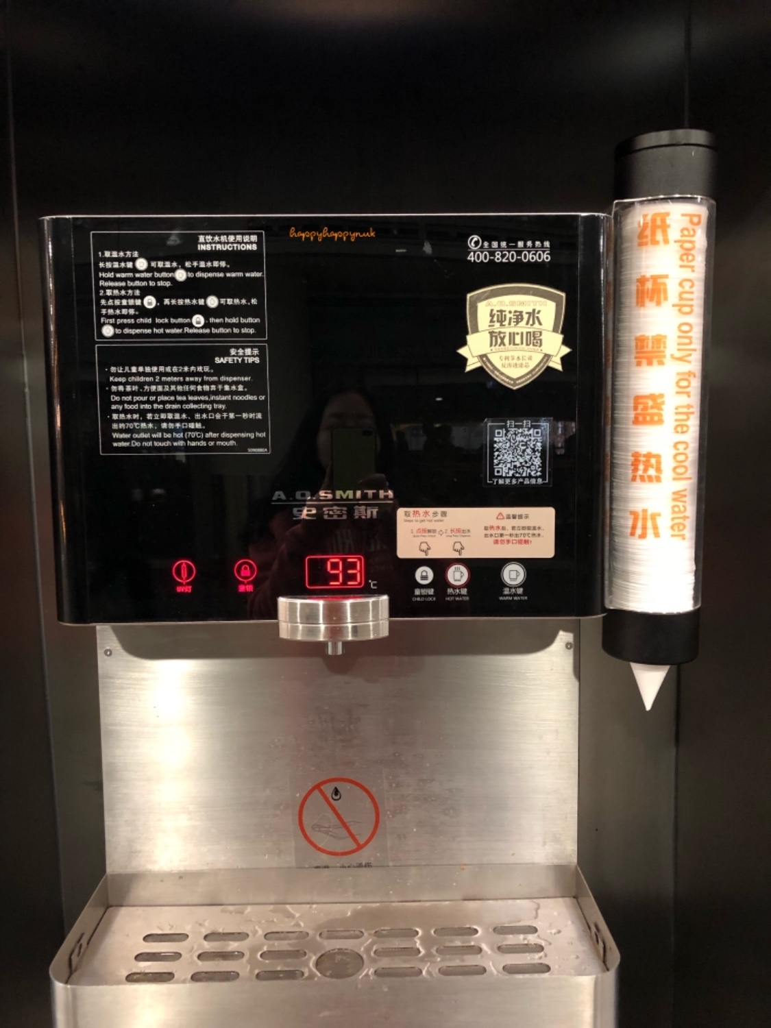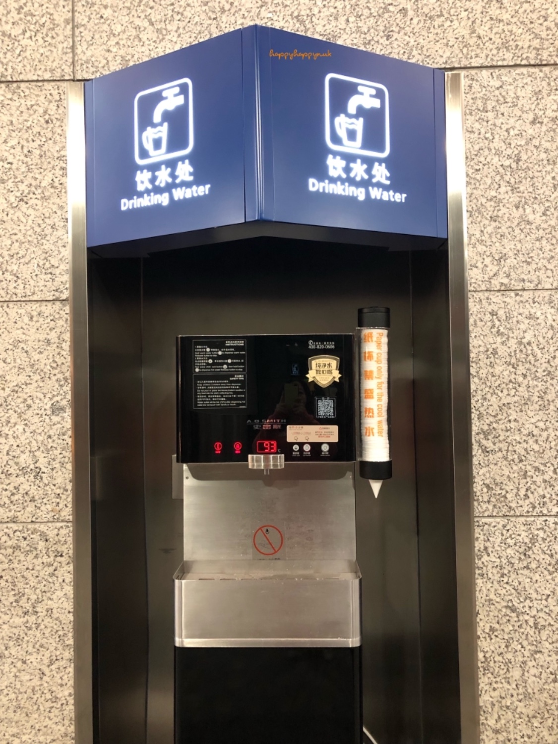 ตู้กดน้ำในแอร์พอร์ต ดู ๆ ไม่มีที่ให้ใส่เงินนะ เวลาซื้อสแกนจ่ายจาก alipay หรือ wechat pay เท่านั้น เป็นสังคมเกือบไร้เงินสดจริง ๆ แต่จะว่าไปก็ไม่เห็นคนจีนใช้เงินสดกันเลย ในแอร์พอร์ตมีตู้กดน้ำร้อนด้วย คนจีนมักพกกระบอกน้ำ ก็กดไปดื่มได้ลดปริมาณขยะดี