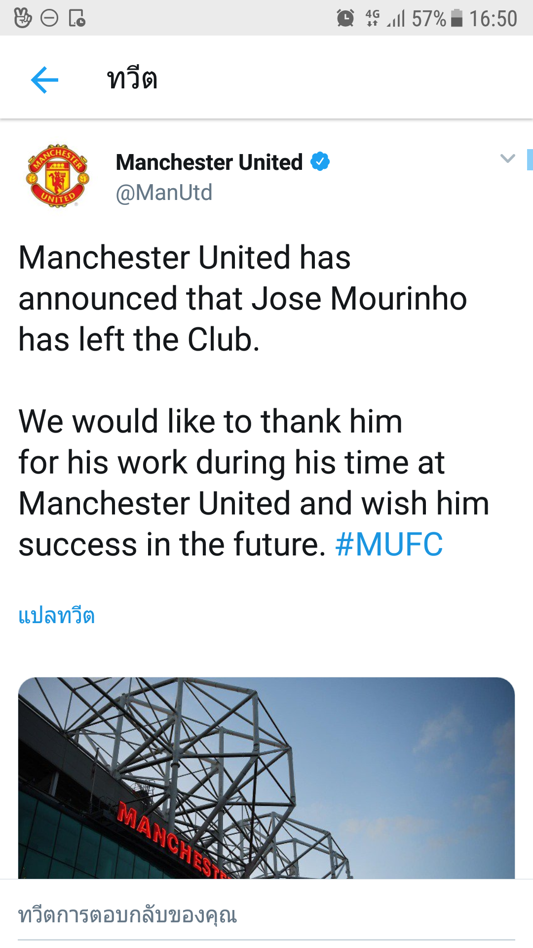 OFFICIAL¬!! ปีศาจแดง ประกาศ ไล่ โจเซ มูรินโญ่ กุนซือแมนยู เรียบร้อย!! แมนเชสเตอร์ ยูไนเต็ด ยืนยันผ่านเว็บไซต์ ของสโมสร ได้แยกทางกับ มูรินโญ่ เฮดโค้ชของทีมเรียบร้อยแล้ว แมนเชสเตอร์ ยูไนเต็ด
