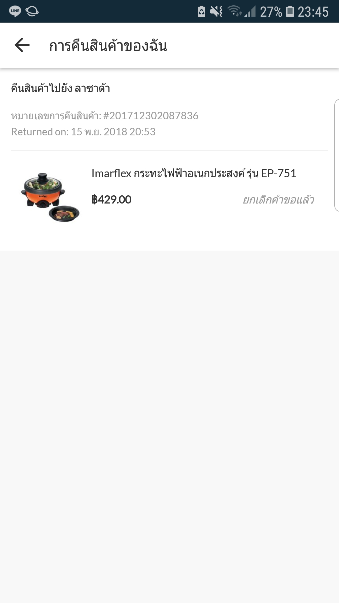 -โดยเราเลือก ให้ kerryมารับของที่บ้าน (เนื่องจากสินค้าเราเป็น lazadamall จึงเลือกเงื่อนไขนี้ได้) แต่kerry ไม่ยอมติดต่อมารับของ บอกว่าจะมาเอาของ พอถึงเวลาไม่มี kerryคนไหน มาเอาของคืนไปเลย เราเลยติดต่อทาง kerry เจ้าหน้าที่kerryเองใฟ้เราติดต่อ lazada เราได้ติดต่อกับ lazada ทาง chat เขาบอกให้เราส่งไปที่ สาขา ของkerry เลย เราก็ใช้ linemanไปส่งให้ ปรากฎว่าส่งไม่ได้ มันขึ้นว่า กรุณาติดต่อเจ้าหน้าที่ เจ้าหน้าที่kerry ลอง scanหรือทำทุกวิถีทางก็ยังไม่ได้ เราเลยให้เอาของกลับมา เราติดต่อ call centerอีกครั้ง(ก่อนหน้านี้ติดต่อหลายรอบแล้ว คือสินค้าเราจะคืนได้ภายใน 15วัน ก่อนหน้านี้เรารอมา7วันแล้วก็ไม่มีเจ้าหน้าที่มารับของคืนไป ซึ่ง call center แจ้งว่าประสานงานกับkerryให้แล้วรอ 4-7 วันจะมีเจ้าหน้าที่รับของ แต่ไม่มีคนมา ซึ่งมาทราบอีกทีตอนเราไปส่งที่สาขา kerryเองว่า cs lazada ไม่ได้ติดต่อให้ เขาบอกเราว่า เขาได้ติดต่อkerryแล้วแต่ก็ไม่ได้รับการติดต่อจาก kerry เช่นกัน)