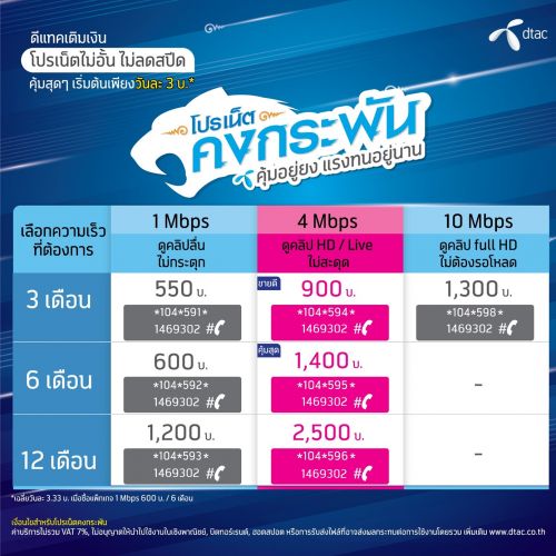 ตอนนี้dtacยังมีเน็ตคงกระพันอยู่ไหมครับ พวก1mbps 3เดือน 6เดือน 12เดือนอ่ะครับ ถ้ามีขอรายละเอียดหน่อยครับ