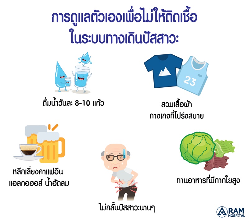 ดังนั้นเมื่อมีอาการติดเชื้อในทางเดินปัสสาวะ จึงควรรีบพบแพทย์เพื่อรับการรักษาซึ่งโดยทั่วไปอาการจะดีขึ้นภายใน 5-7 วัน ทั้งนี้ผู้สูงอายุควรดูแลตัวเองให้ดีเพื่อไม่ให้ติดเชื้อในระบบทางเดินปัสสาวะ ด้วยการดื่มน้ำมากๆ อย่างน้อยวันละ 8-10แก้ว เพื่อทำให้ปัสสาวะเจือจางและล้างเชื้อโรคออกจากกระเพาะปัสสาวะ ส่งผลให้แบคทีเรียลดลง ดูแลสุขอนามัยบริเวณอวัยวะเพศให้สะอาด สวมเสื้อผ้า กางเกงที่โปร่งสบายเพื่อป้องกันการอับชื้น หลีกเลี่ยงเครื่องดื่มที่มีคาแฟอีน แอลกอฮอล์ ชา น้ำอัดลม ไม่กลั้นปัสสาวะนานๆ รวมถึงการรับประทานอาหารที่มีกากใยสูงเพื่อป้องกันท้องผูก เพราะมีผลต่อการทำงานของลำไส้และกระเพาะปัสสาวะ และให้ความสำคัญกับการดูแลสุขอนามัยซึ่งจะช่วยป้องกันและลดภาวะแทรกซ้อนที่อาจเกิดขึ้นได้ครับ