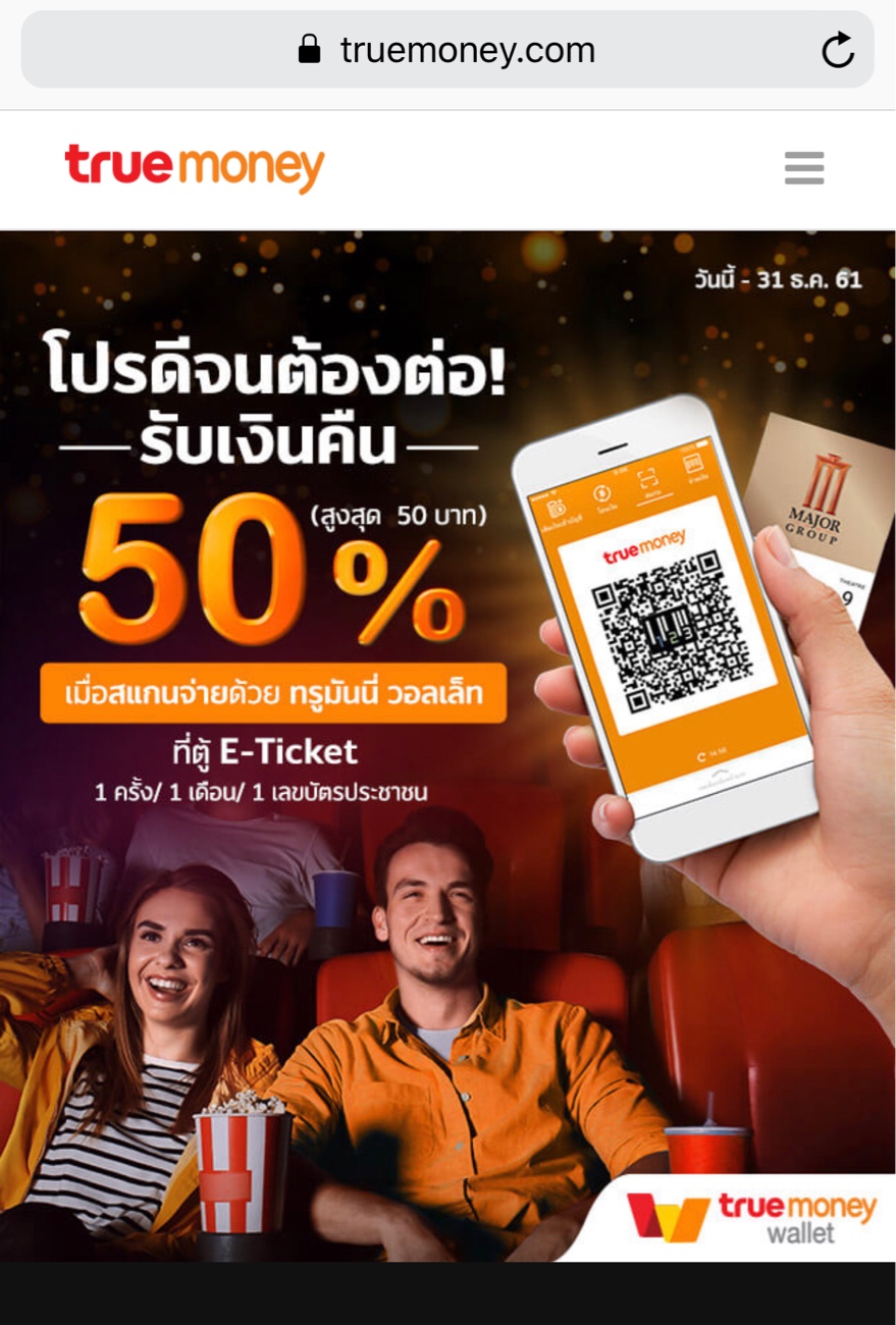 เตือนกับคนชอบดูหนังนะครับ วันนี้ไปดูหนังเครือเมเจอร์มีโปรโมชั่นมากมายแต่ไปเห็นโฆษณาว่าจ่ายผ่านวอลเลทได้เงินคืน 50% ตามภาพ