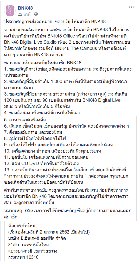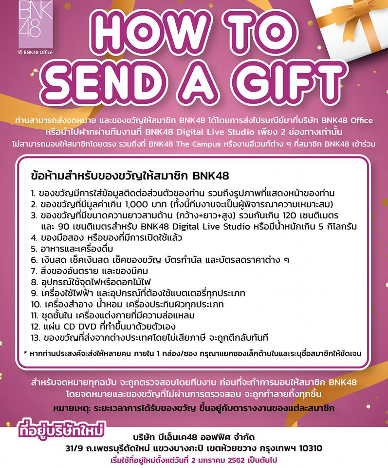 ประกาศกฎการส่งจดหมาย,ที่อยู่ใหม่, ของขวัญให้สมาชิก BNK48