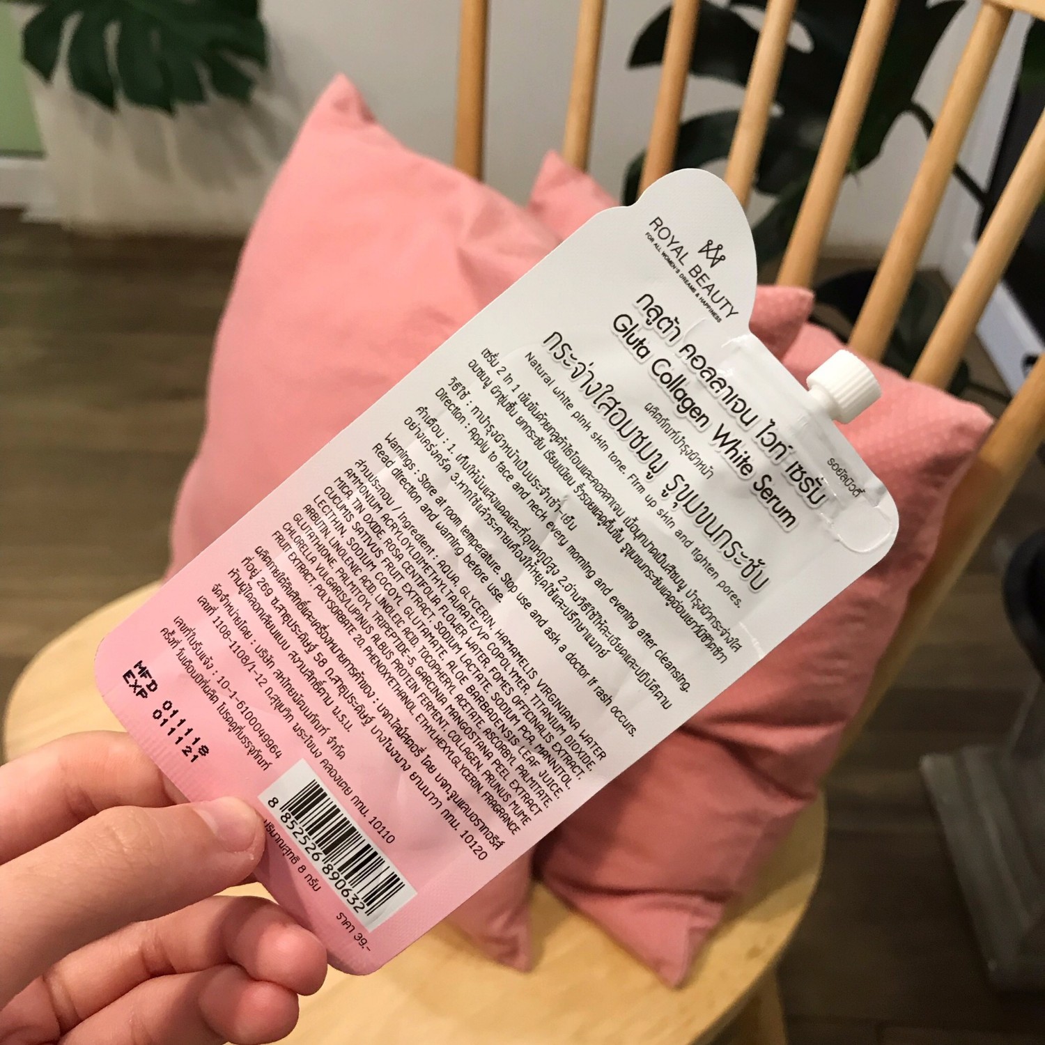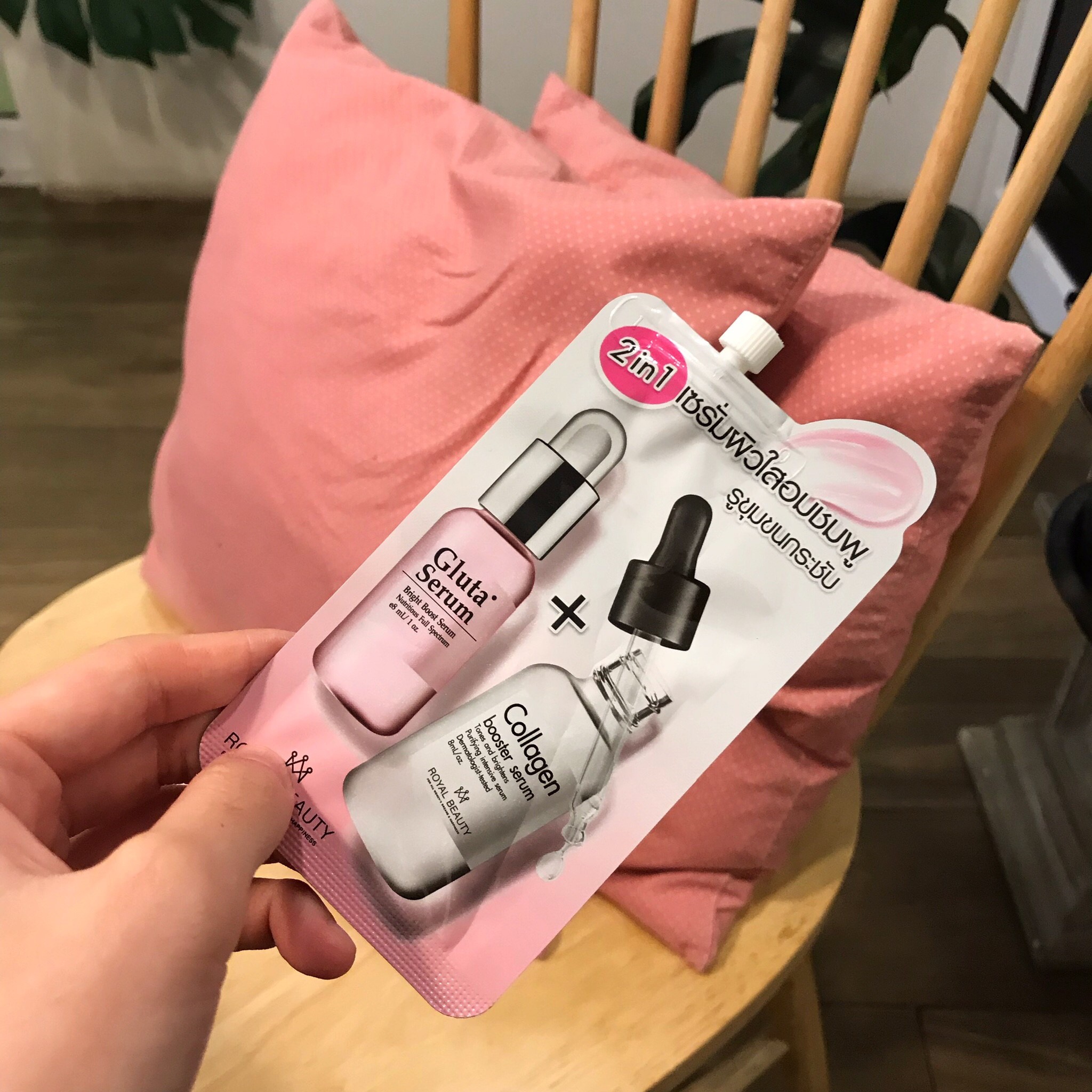 เริ่มเเรกหลังจากล้างหน้าเสร็จก็ทาเซรั่มตัวนี้เลย เป็นตัวเด็ดเคล็ดลับของเรามาก น้องคือ 2in1 เซรั่มผิวใสอมชมพู รูขุมขนกระชับ ของ Royal Beauty เป็นเซรั่มซองในเซเว่น ตัวนี้บอกเลยว่าเป็น Top Secret ของเราจริงๆ ทาเเล้วหน้าใสอิ่มน้ำ เนียนเเบบเเทบหารูขุมขนไม่เจออ่ะ ใช้มาซักพักเเล้ว จนเห็นผลเลยเอามารีวิว จริงๆเราเป็นคนเเพ้ค่อนข้างง่ายนะ เเต่เจอตัวนี้รู้สึกถูกจริตหน้ามาก เนื้อเซรั่มสีชมพูอ่อนมีวิ้งค์ๆ ทาง่ายไม่เหนียวด้วย ทาเเล้วประมาณนี้เลย