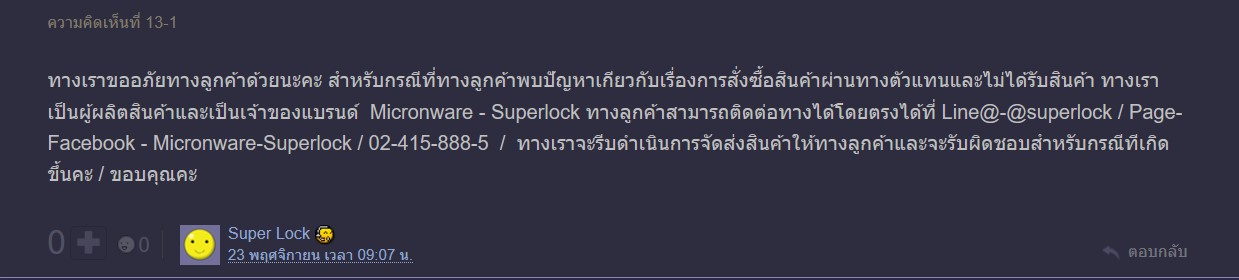 ขอบคุณสมาชิกพันทิปคุณ BeeJang ความคิดเห็นที่2 มากๆนะคะที่ช่วยให้ข้อมูลกับเราได้ตามเรื่องนี้กับแบรนด์สินค้าได้โดยตรง จนได้รับการโอนเงินคืนในวันนี้วันที่ 27/12/2018 เรื่องคือทางร้าน Super Lock Official Shop ซึ่งเป็นตัวแทนจำหน่ายใน Shopee มีปัญหาสต๊อกและการจัดส่ง ในช่วงที่ Shopee จัดรายการ 11/11 ซึ่งเราก็ได้สั่งซื้อสินค้าในวันนี้ด้วย วันที่ 11/11/2018 แล้วก็มีปัญหา ซึ่งมีลูกค้าจำนวนหลายรายก็มีปัญหา การส่งของ ได้รับสินค้าไม่ตรง ในช่วงนี้เหมือนๆกัน และได้รับการบริการหลังการขายที่แย่จากทางร้านเหมือนเรา จนหาทางติดต่อบริษัท(แบรนด์)เองได้เหมือนเราในวันนี้ ได้คุยกันปัญหาก็จบไวค่ะ เพราะทางแบรนด์ทราบปัญหาเค้าก็ดำเนินการได้ทันที ถ้าใครมีปัญหาแบบเราให้ติดต่อโดยตรงไปทางแบรนด์เลยค่ะ