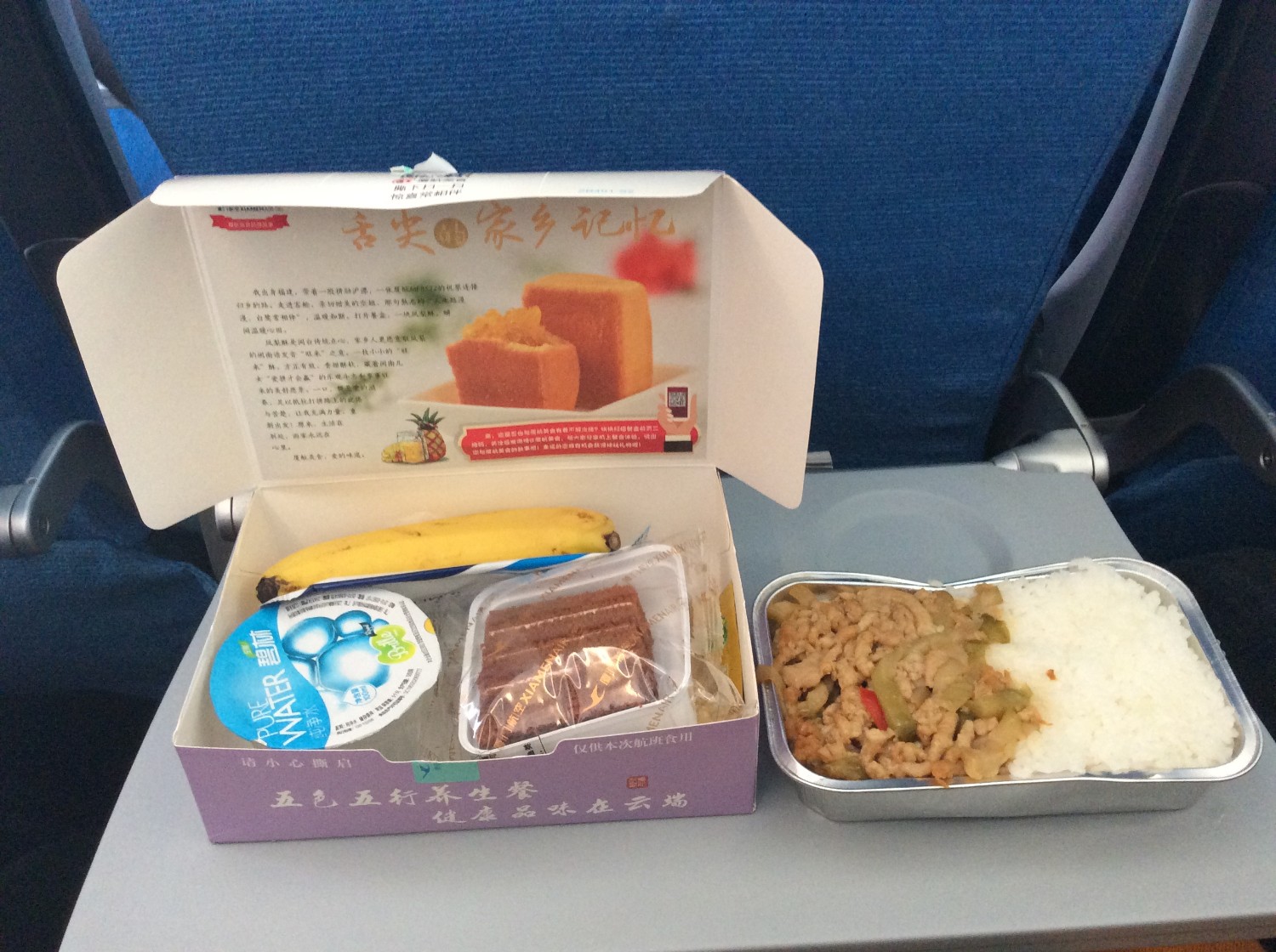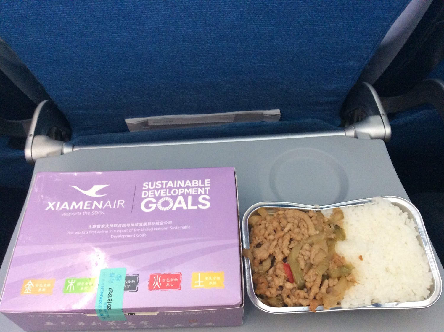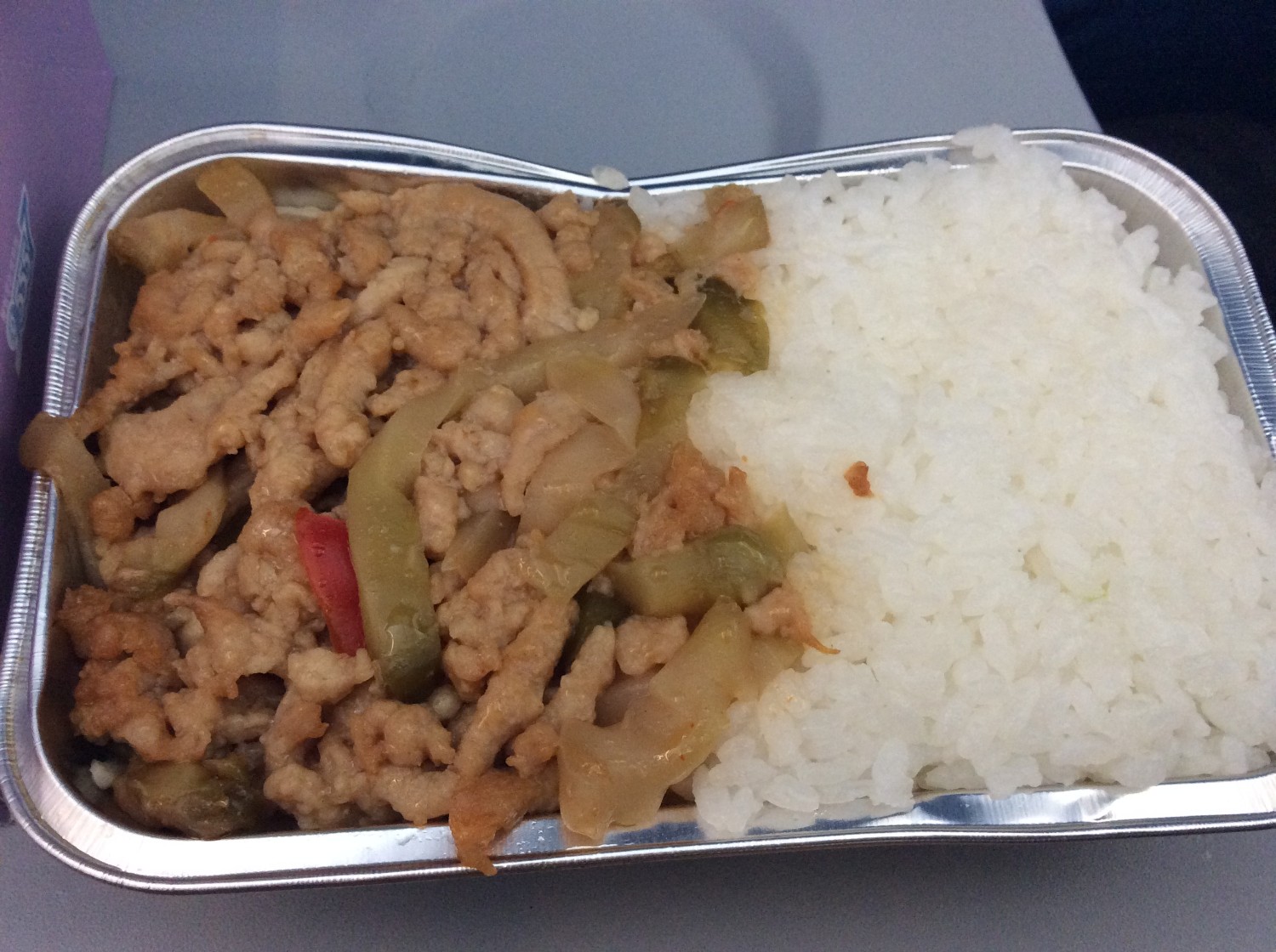 เราบินตอนบ่ายจะมีให้เลือกระหว่าง ข้าวผัดกับข้าวหน้าหมูผัดผัก โดยข้าวผัดไม่ได้ถ่ายรูปมาค่ะ แต่เป็นข้าวผัดใส่ทูน่า และมีรากบัวชุบแป้งทอดค่ะ ซึ่งทั้ง 2 อย่างรสชาติค่อนข้างจืดค่ะ แนะนำให้ใส่ซอสพริกที่อยู่ในกล่องนะคะ ก่อนเครื่องจะลงจอดจะมีบริการแจกลูกอมค่ะ