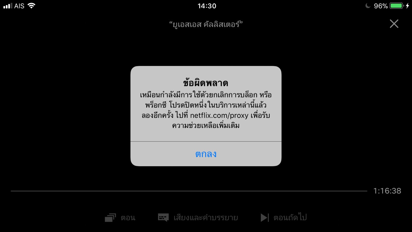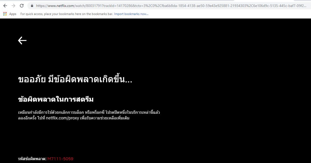 ปกติแล้วสามารถรับชม Netflix บน PC ได้ด้วย Browse Chrome การตั้งค่าคอมพิวเตอร์เหมือนเดิมทุกอย่างไม่ได้ไปปรับส่วนใด แต่ตั้งแต่เมื่อคืนเข้าหน้าแรกได้แต่พอเลือกเรื่องที่จะดู ก็ขึ้น Error ตามภาพเลยค่ะ ลองเปลี่ยนเป็น Firefox แล้วก็เข้าไม่ได้เหมือนกัน แต่อินเตอร์เน็ทสามารถเข้าใช้งานเว็บอื่น ๆ แอปอื่น ๆ ได้ไม่มีปัญหา