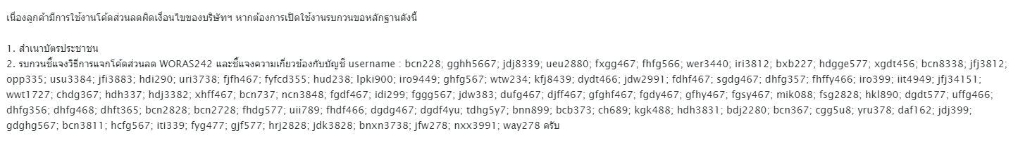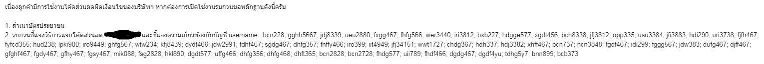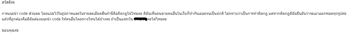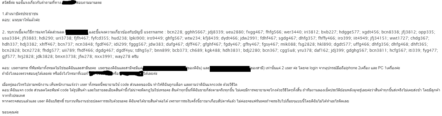 ทางผมก็ตอบกลับไปอีกว่าไม่ได้มีความเกี่ยวข้อง และไม่เคยรู้จัก user เหล่านั้น และมีการตอบคำถามเจ้าหน้าที่ทาง call center ที่ถามว่าทางผมแจก code ส่วนลดด้วยวิธีใด ซึ่งปกติวิธีที่แจก code คือใส่ไว้ใต้รูปภาพ และไว้ในคำอธิบายสินค้า