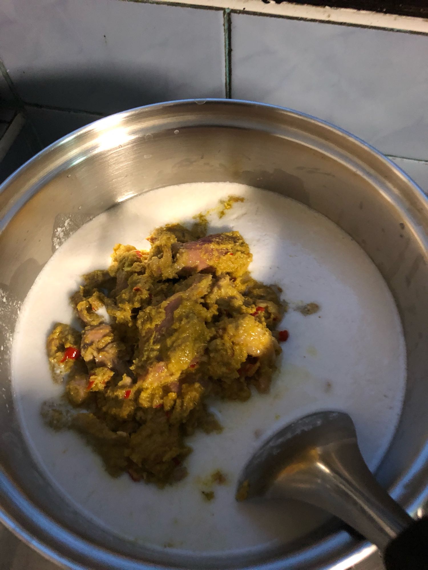 เอาเนื้อกับพริกแกงที่ผัดรวมกันใส่ลงหม้อกะทิที่ต้มหน่อไม้รออยู่พร้อมกับใส่ใบมะกรูด