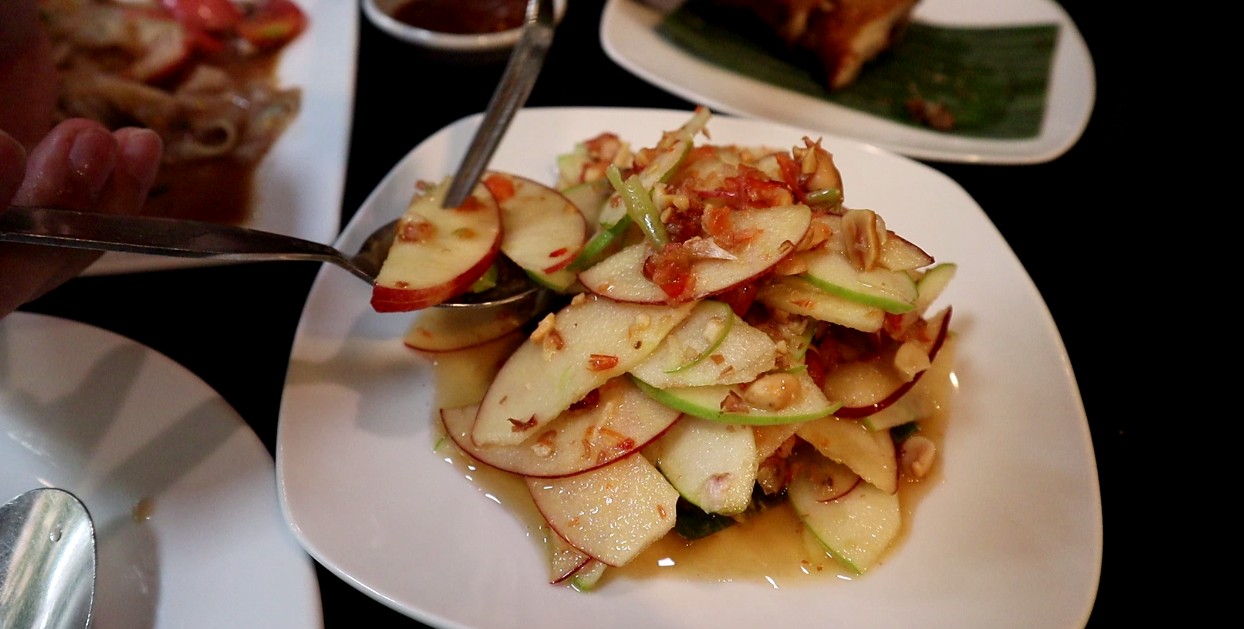 ตำแอปเปิ้ล จานนี้ถือว่าเป็นเหมือนเมนูพักลิ้น และเป็นกึ่งๆของหวานก็ว่าได้ เพราะรสชาติออกไปทาง