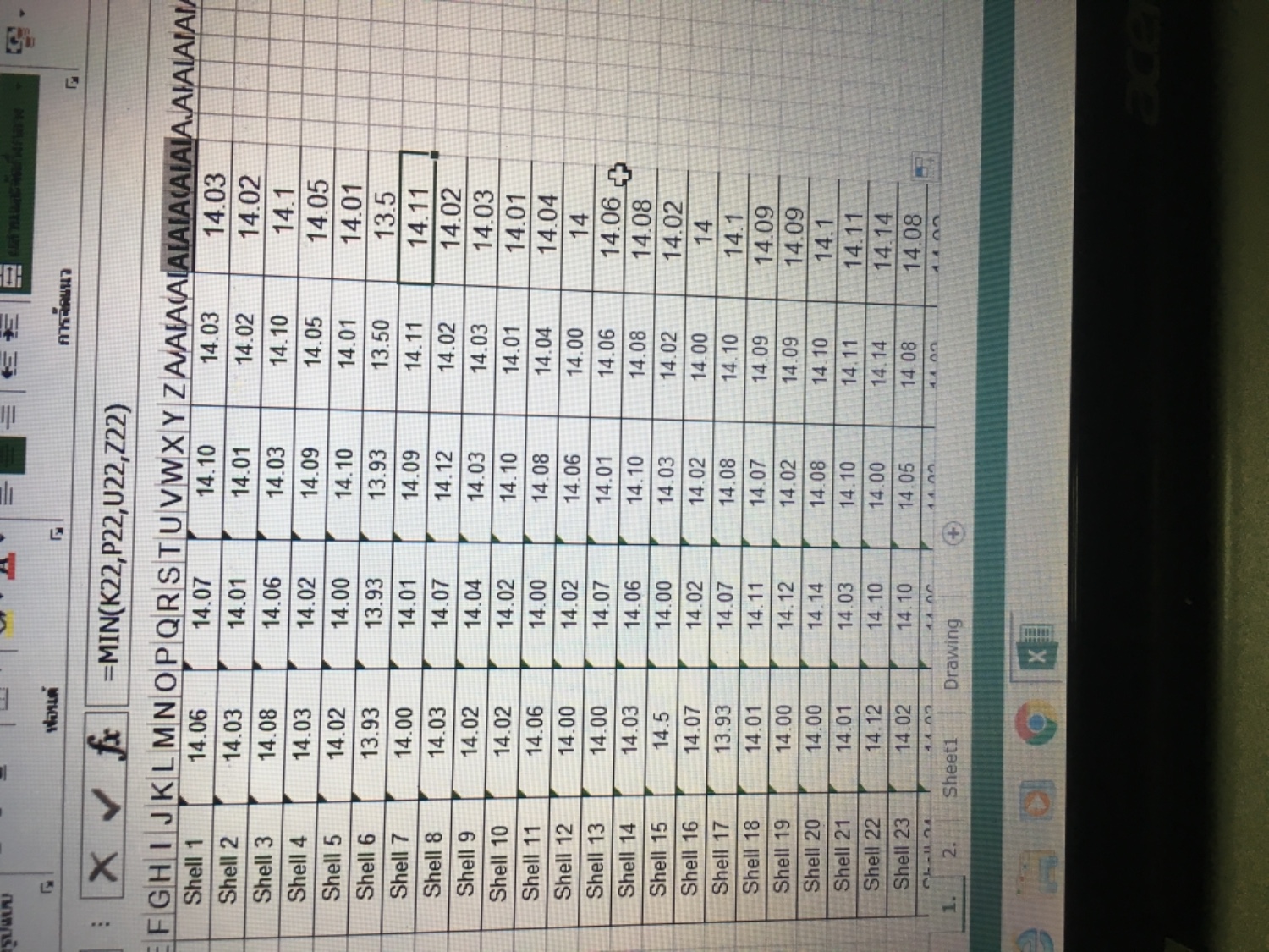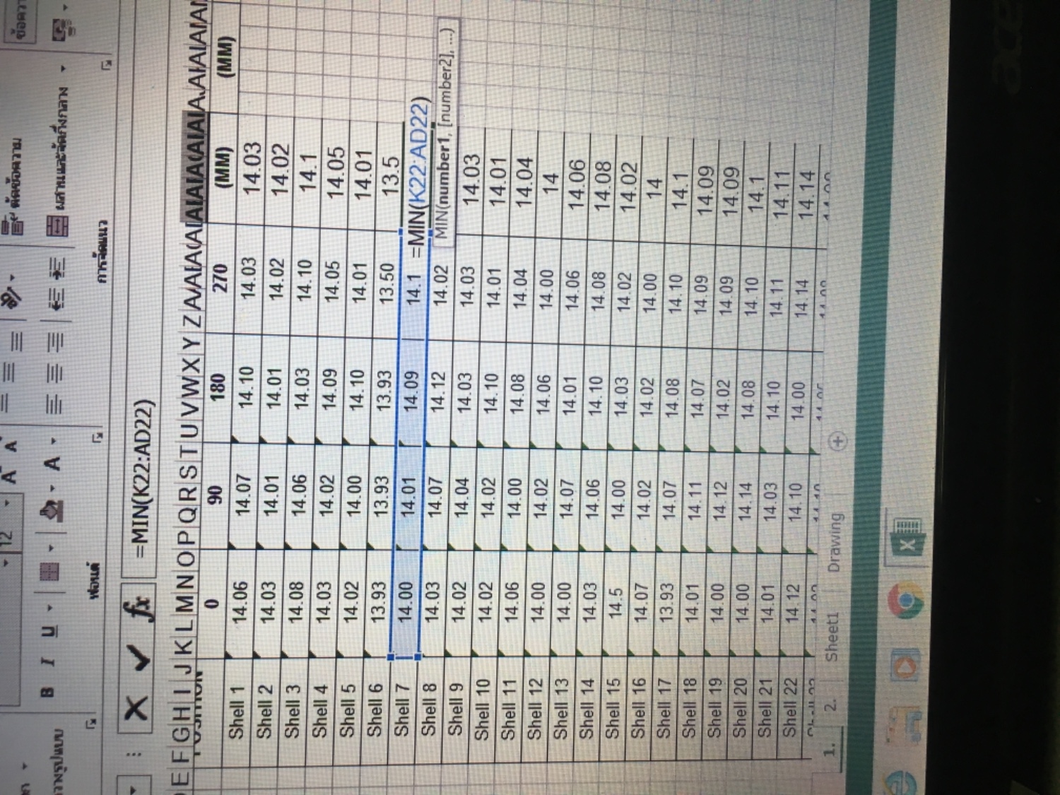 ซึ่งในช่องหลังสุดผมใช้คำสั่ง =MIN(K22:AD22) เพื่อหาค่าน้อยสุดออกมา