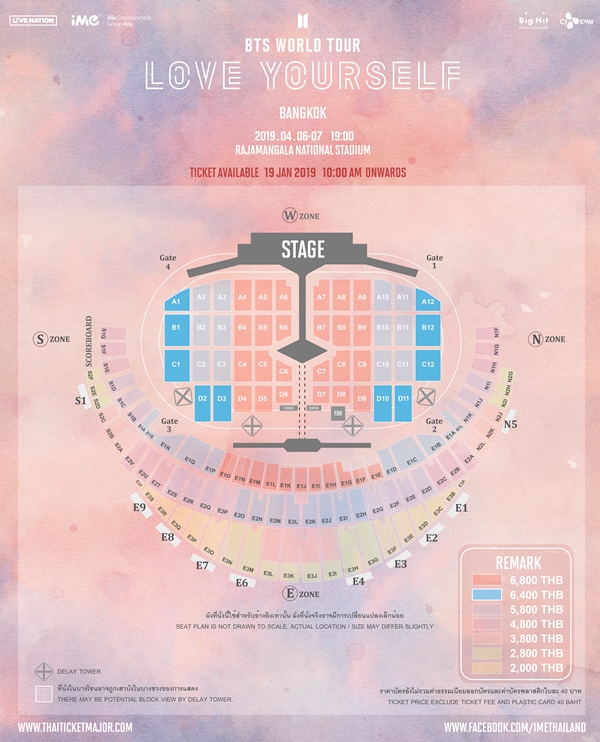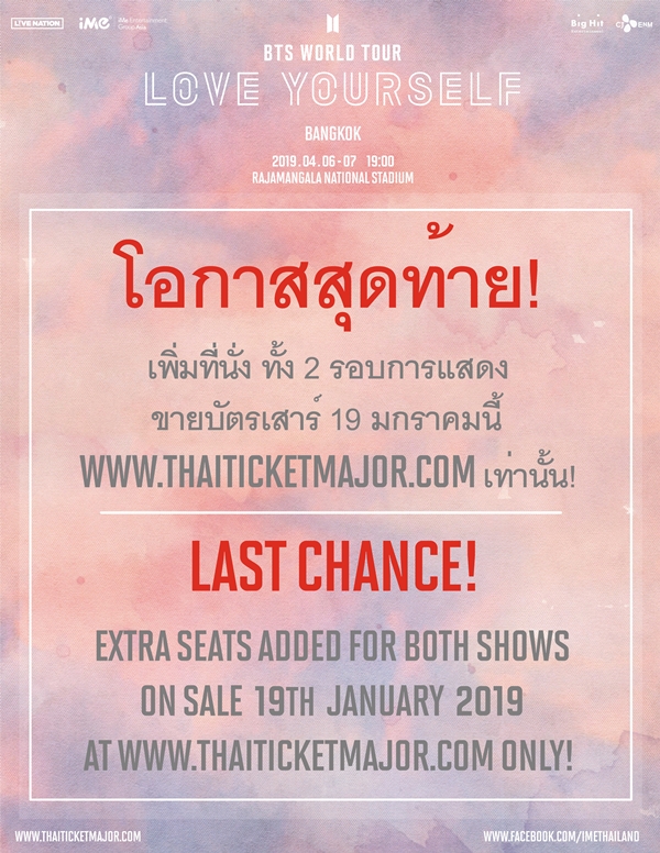 BTS WORLD TOUR ‘LOVE YOURSELF’ BANGKOK ในวันเสาร์ที่ 6 และวันอาทิตย์ที่ 7 เมษายน 2562 ณ ราชมังคลากีฬาสถาน ที่แม้จะขายบัตรหมดเกลี้ยงไปกว่า 80,000 ใบแล้ว แต่งานนี้ผู้จัด ไอมี่ไทยแลนด์ ( iMe Thailand ) และ Bighit Entertainment ต้นสังกัดของศิลปิน ทนเสียงเรียกร้องจากอาร์มี่ (ชื่อแฟนคลับ) ทั้งชาวไทย และชาวต่างชาติไม่ไหว ประกาศเพิ่มที่นั่งทั้ง 2 รอบการแสดง กับบัตรราคา 6,400 บาท รวมทั้งมีการนำบัตรที่ตรวจสอบพบว่าเข้าข่ายทำผิดกฎขายบัตรนอกระบบ และขายบัตรเกินราคาจริงกลับเข้าสู่ระบบขายบัตรอีกครั้ง เพื่อให้แฟนๆ ตัวจริงได้รับบัตรกันอย่างถ้วนหน้าอีกด้วย ถือเป็นการปราบเหล่ามิจฉาชีพให้อยู่หมัดอย่างจริงจัง!