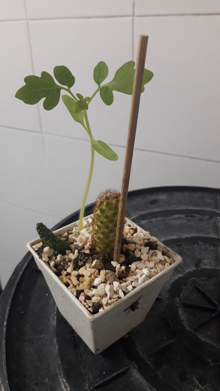 คือเจ้าต้นอ่อนเขียวๆนี้ มันมาขึ้นอยู่กระถางเดียวกันกับกระบองเพชรที่เพื่อนให้มา แต่เมื่อสอบถามไปยังเพื่อน เธอก็บอกว่าไม่รู้เช่นกัน เพราะที่บ้านของเธอตรงที่ปลูกต้นกระบองเพชรก็ไม่ได้ปลูกต้นไม้พันธุ์อื่นเลย ตอนที่ได้มาก็ไม่มีทีท่าว่าจะมีต้นอ่อนจิ๋วๆติดมาด้วย