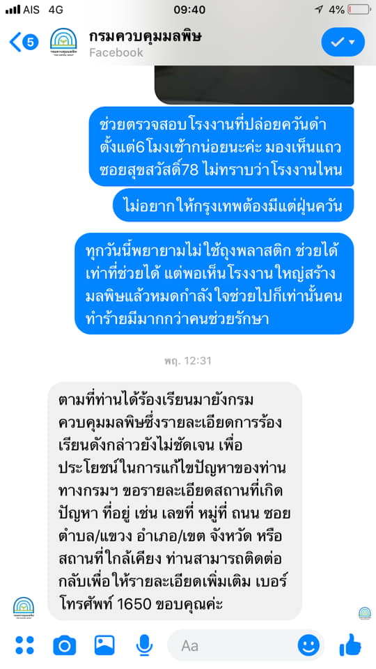 "โรงงานแถวบ้านปล่อยควันดำตั้งแต่7โมงเช้า ซึ่งอาการกำลังดี #แจ้งกรมควบคุมมลพิษแต่คำตอบคือต้องไปหาข้อมูลบ้านเลขที่ชื่อตำแหน่งที่ชัดเจน"