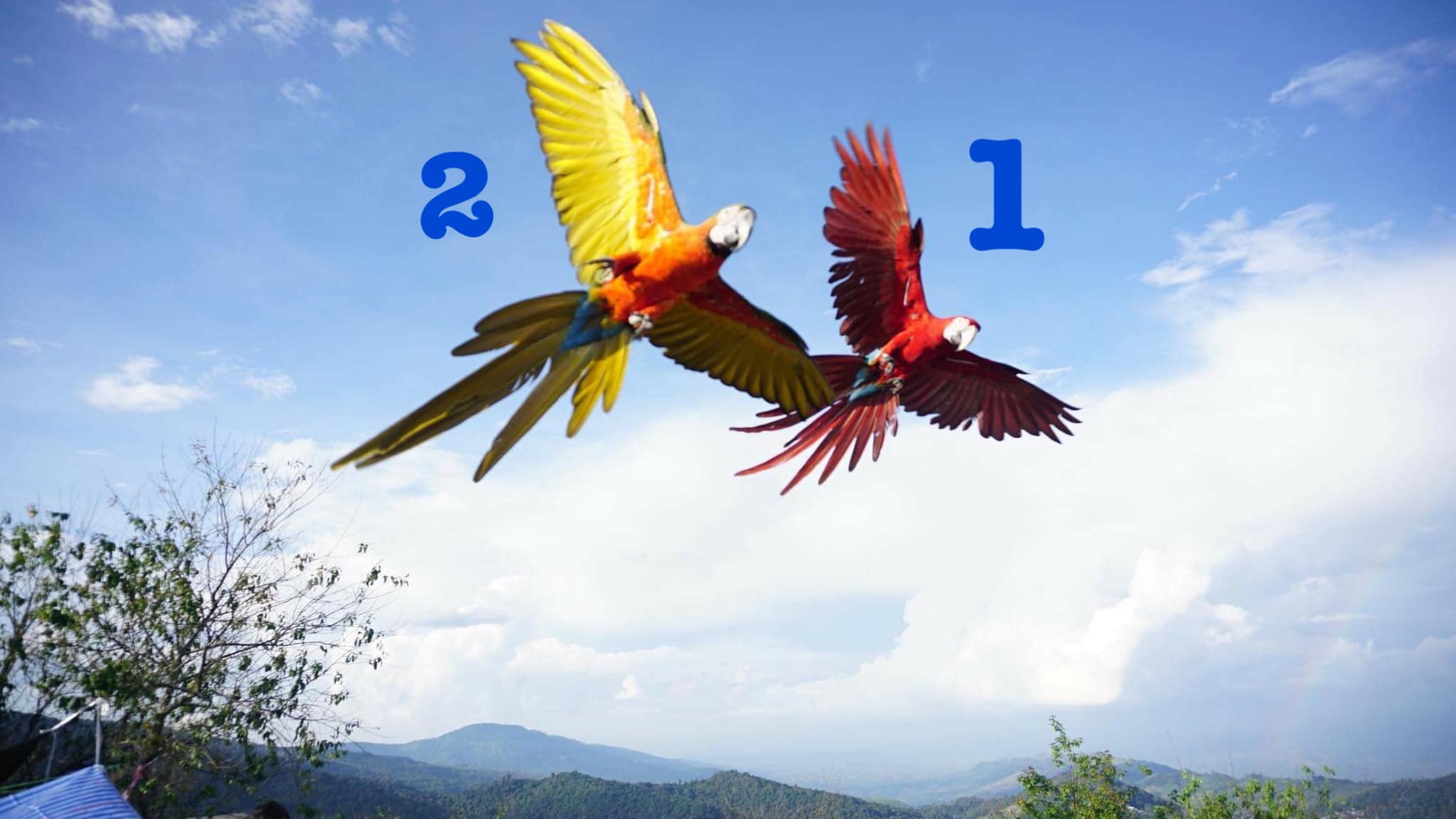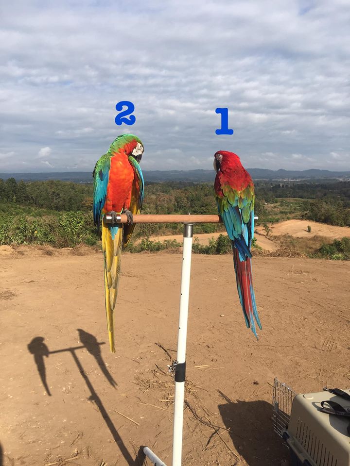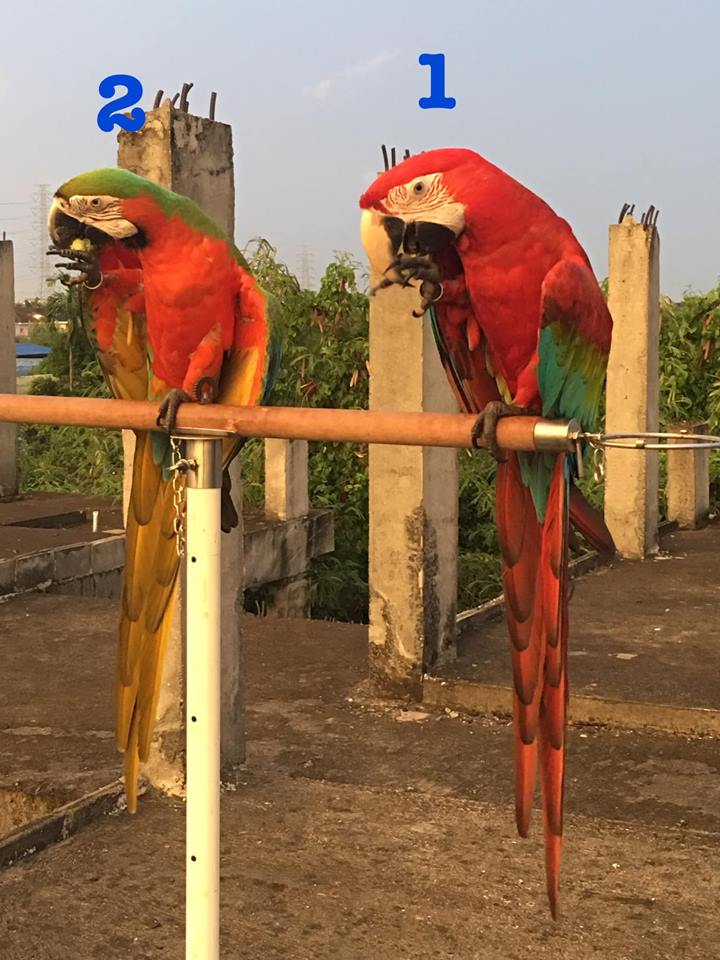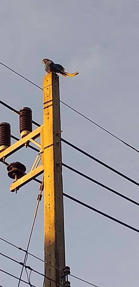 #นกแก้วตัวโตหัวสีแดง ปีกสีฟ้าเขียว ขนาดตัวเท่าๆไก่ หางยาว เสียงร้องดังอ๊ากๆหลุดหายบริเวณ