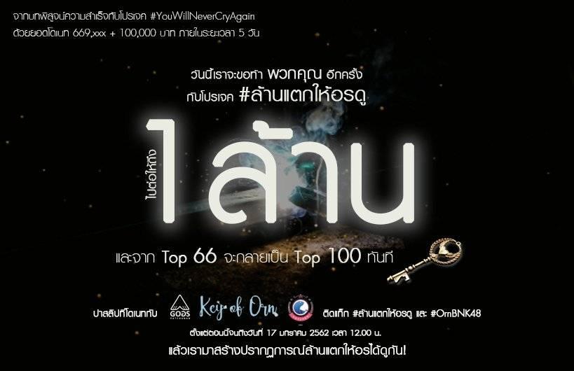 “จากโปรเจค you will never cry again ทางคนทำกุญแจได้เสนอว่าถ้าถึงหนึ่งล้าน จะแจกกุญแจไปเลย 100 ดอก สำหรับ 100 อันดับแรก